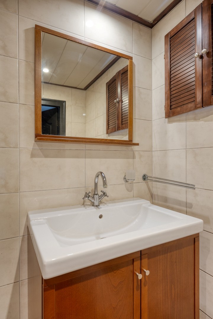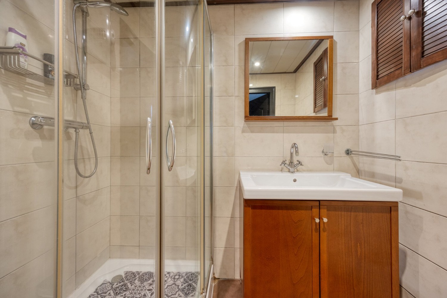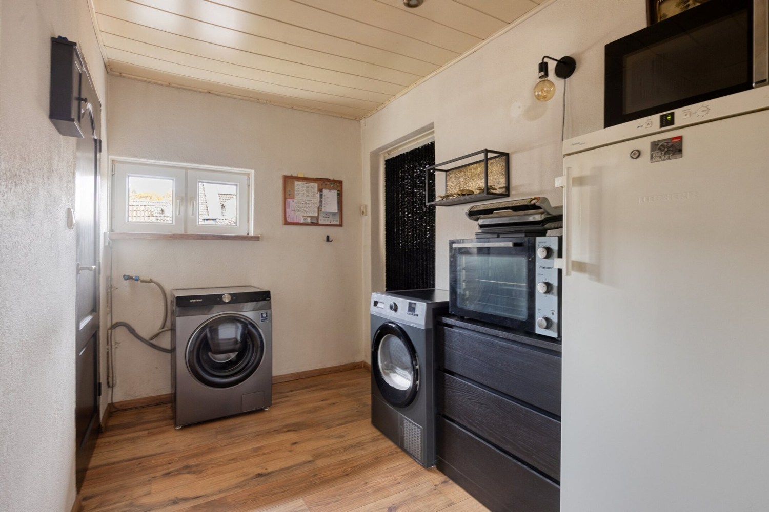 Aparte leefkeuken met keuken in een lengteopstelling met gaskookplaat en afzuigkap. Praktische halfverdiepte kelder; ideaal voor de voorraad. In het verlengde van de keuken is de bijkeuken gelegen met witgoedaansluitingen en achterdeur naar de tuin. Vanuit de bijkeuken toegang tot de badkamer begane grond met douchecabine en wandmeubel met wastafel en een aparte toiletruimte met hangend toilet.