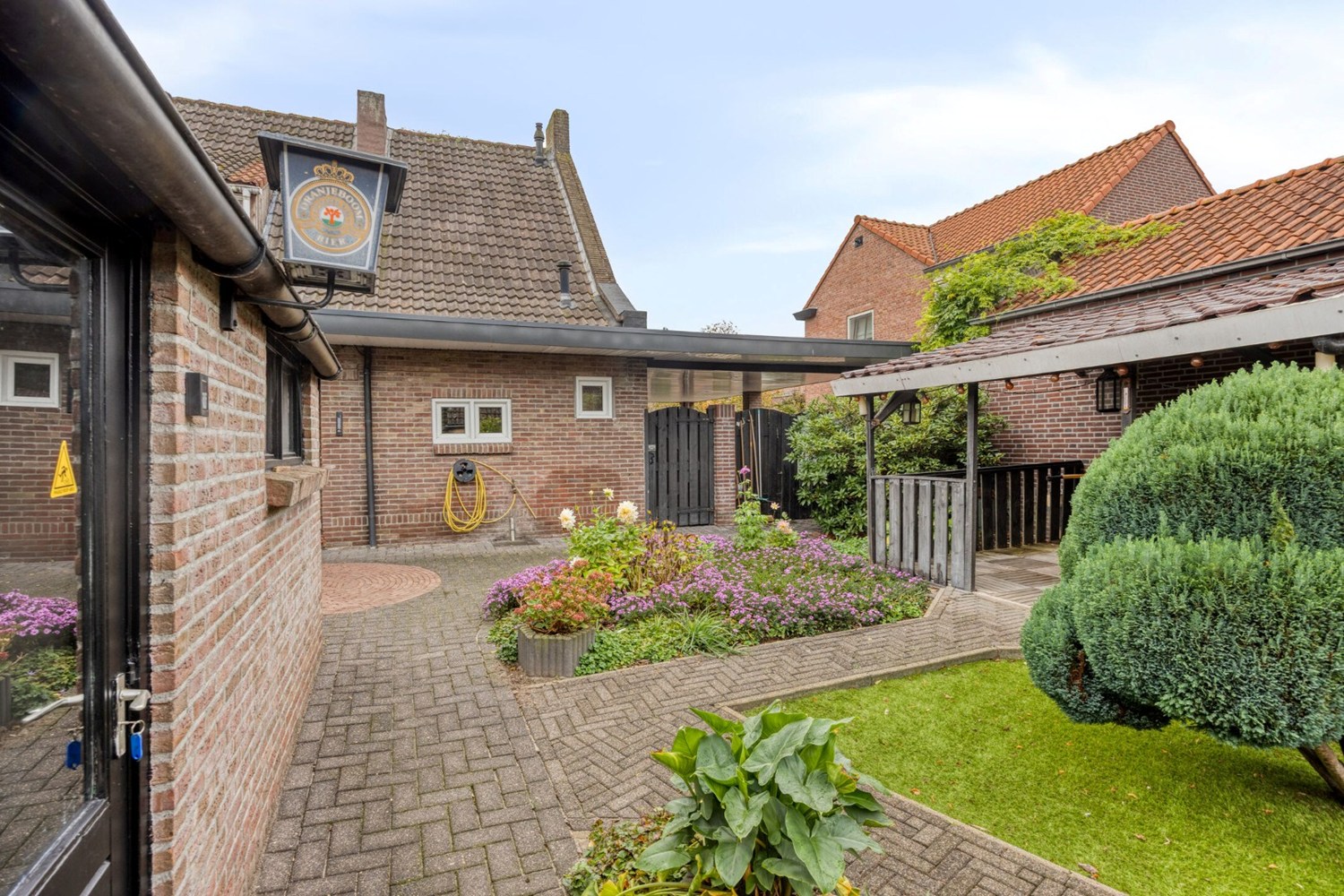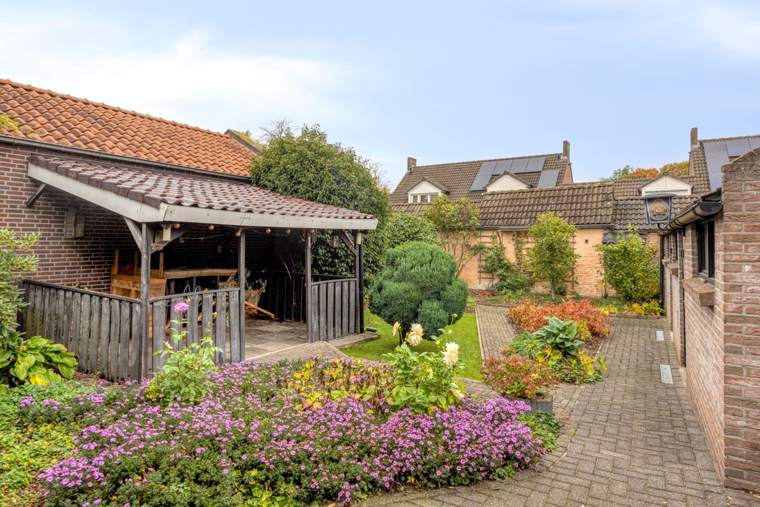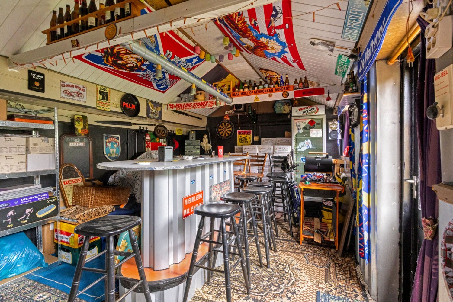 De ruime achtertuin is ingericht met bestrating, gazon en overkapping aan de zijkant van de woning. Het bijgebouw is ingedeeld in twee gedeelten; de voorzijde is ingericht als een café en het achterste gedeelte als buitenberging. Er is een aparte deur vanuit de oprit naar de tuin maar er is ook nog een dubbele poort aanwezig zodat u met de aanhangwagen achter in de tuin kunt komen. Verder is er een brede oprit aanwezig met carport. De tuin is gelegen op het noorden maar is groot genoeg om diverse zitjes te creëren.