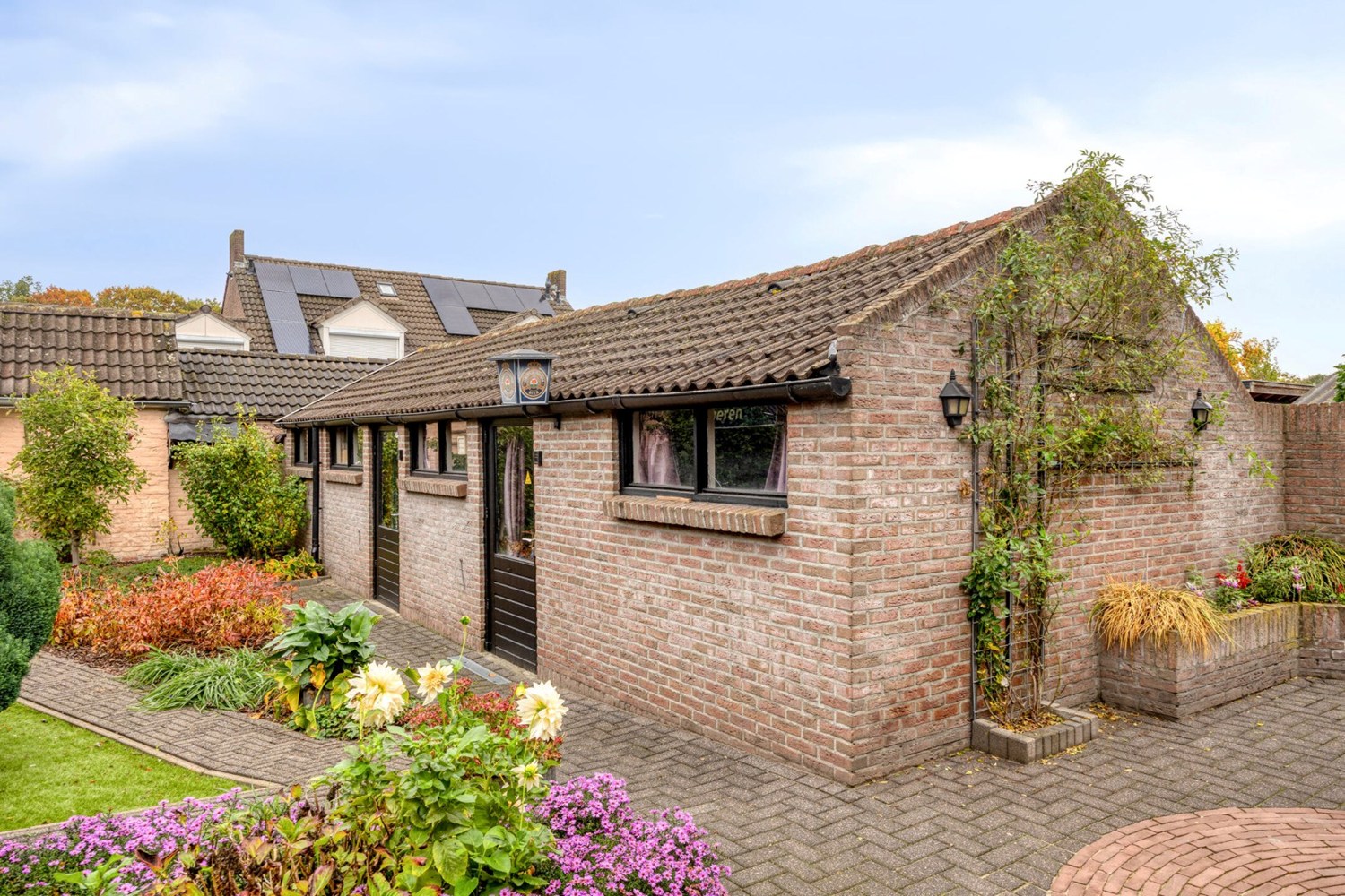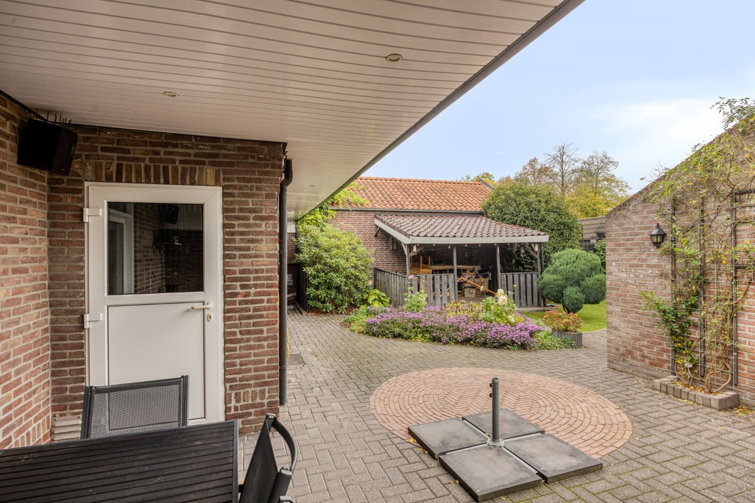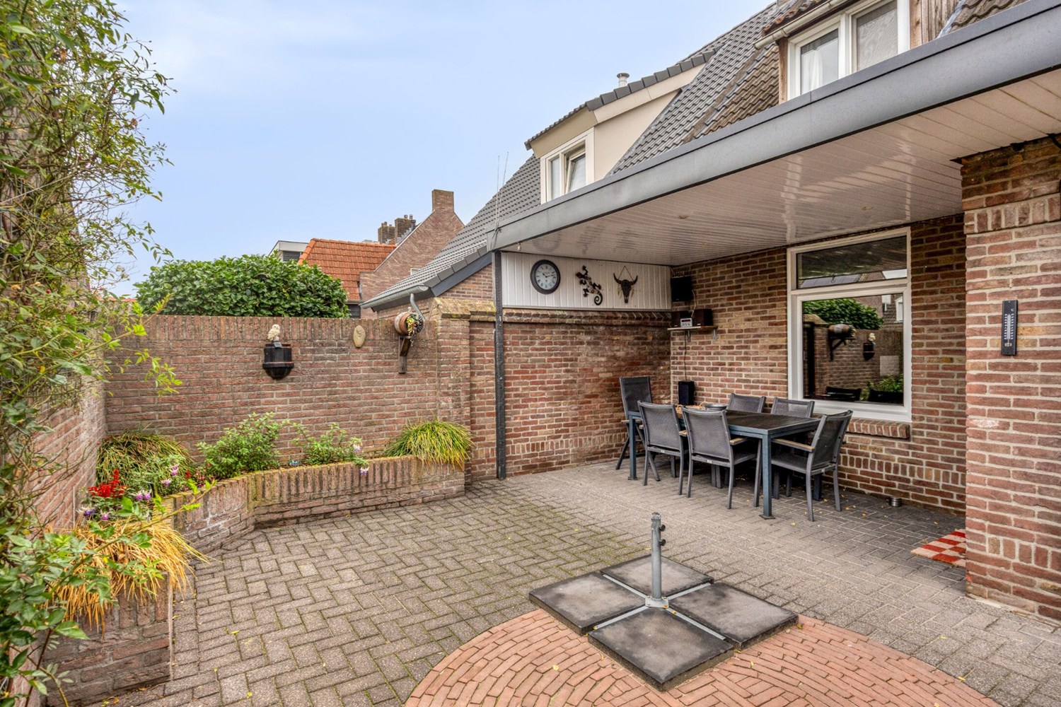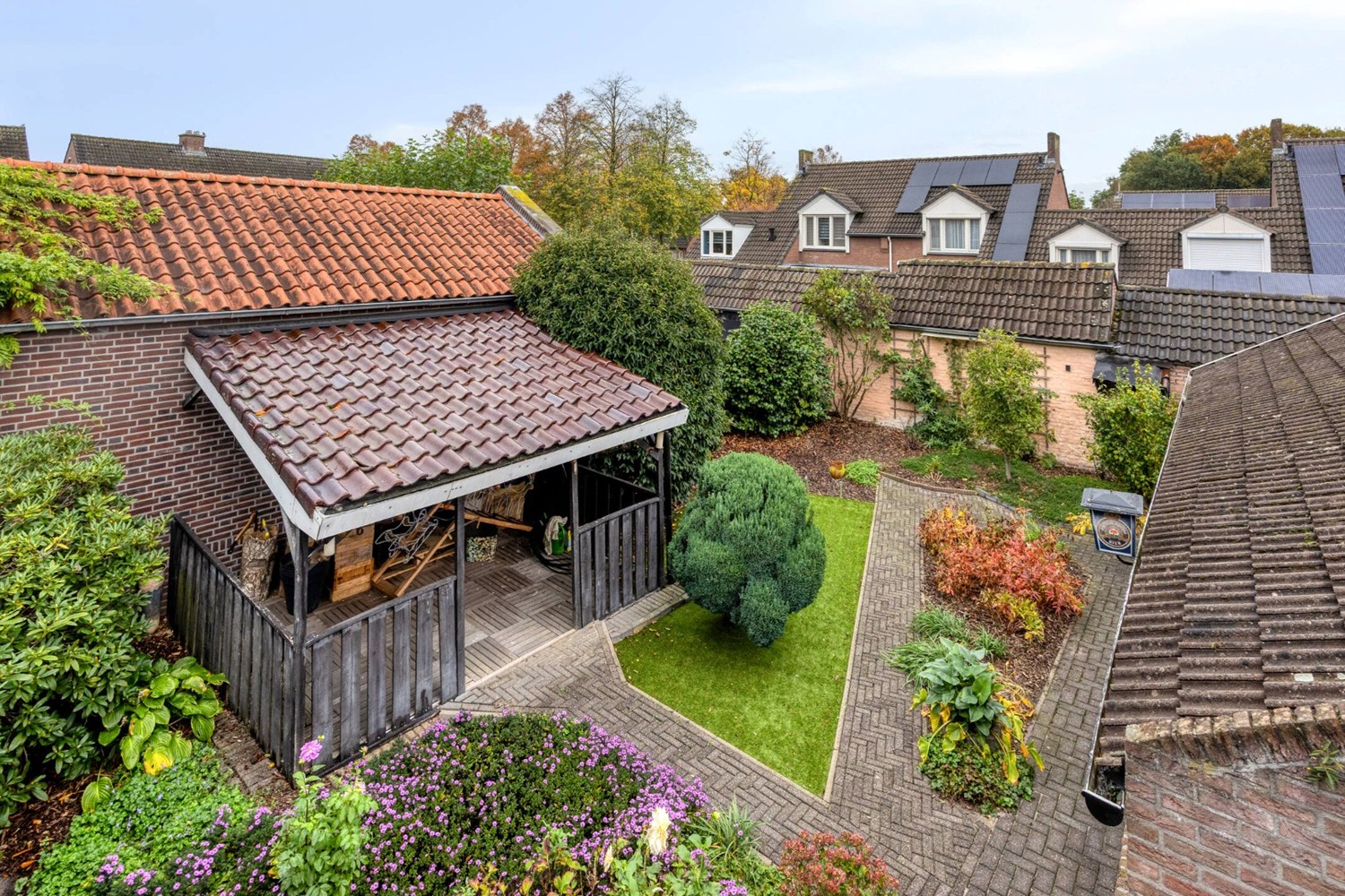 De ruime achtertuin is ingericht met bestrating, gazon en overkapping aan de zijkant van de woning. Het bijgebouw is ingedeeld in twee gedeelten; de voorzijde is ingericht als een café en het achterste gedeelte als buitenberging. Er is een aparte deur vanuit de oprit naar de tuin maar er is ook nog een dubbele poort aanwezig zodat u met de aanhangwagen achter in de tuin kunt komen. Verder is er een brede oprit aanwezig met carport. De tuin is gelegen op het noorden maar is groot genoeg om diverse zitjes te creëren.