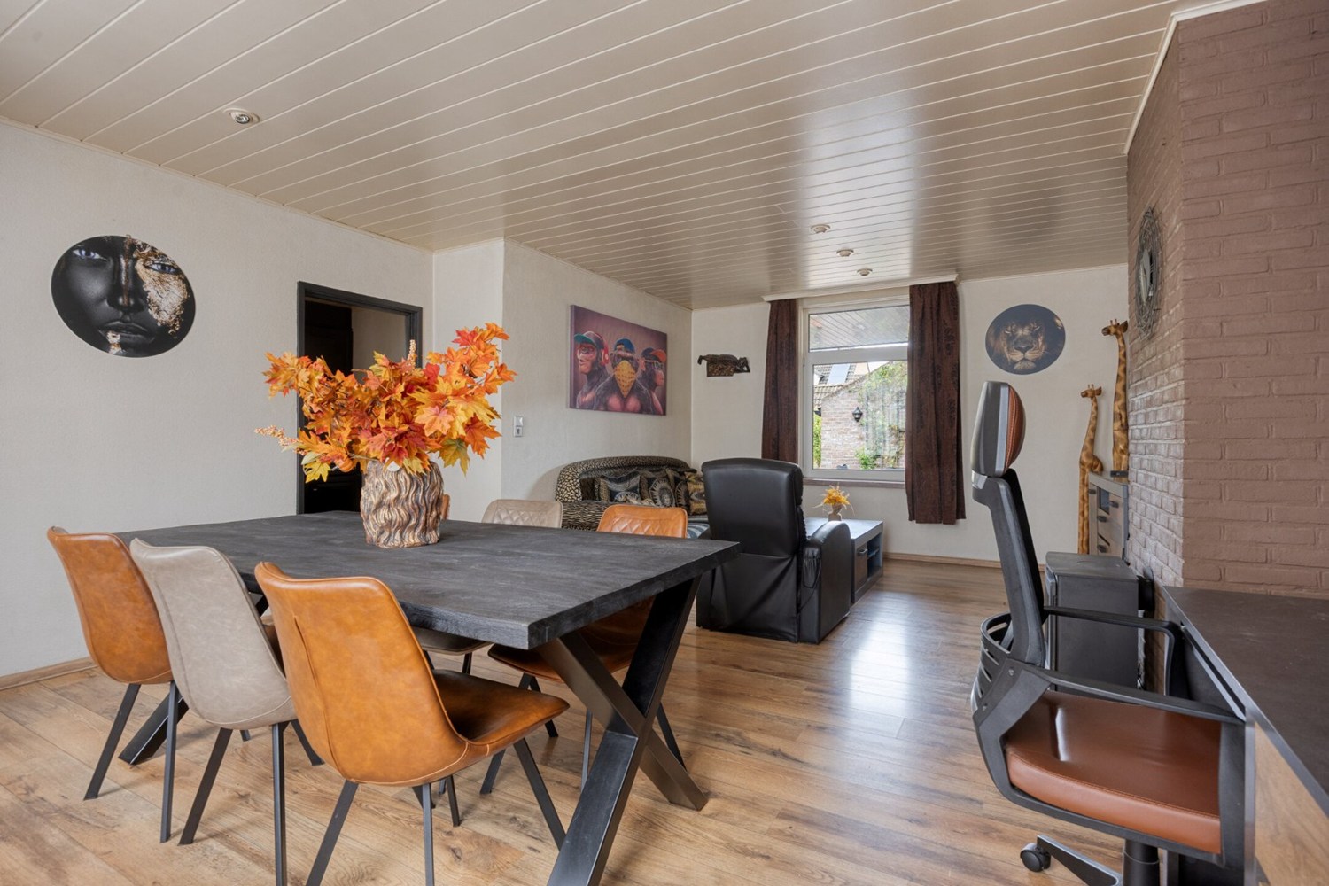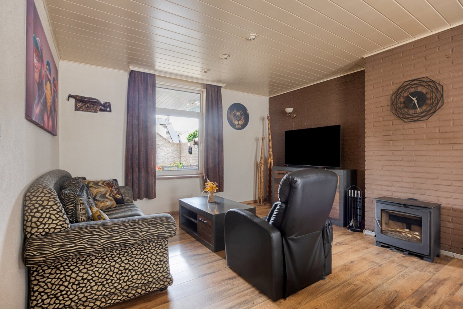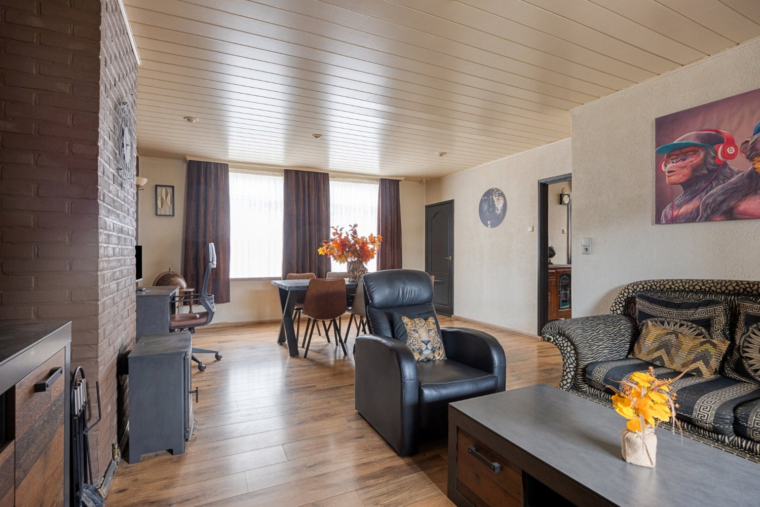 Entree aan de voorzijde van de woning, hal met meterkast en trapopgang naar de 1e verdieping, ruime woonkamer met zit- en eethoek en een houtkachel. De woonkamer is afgewerkt met een laminaatvloer, stucwerkwanden en een mdf-schroten plafond.