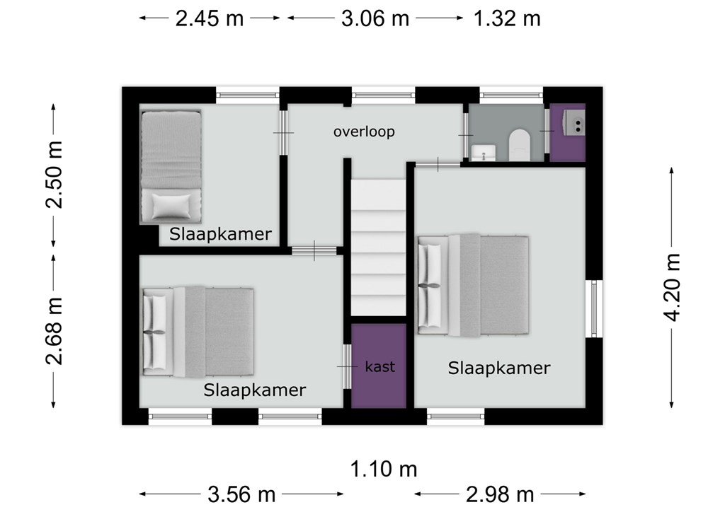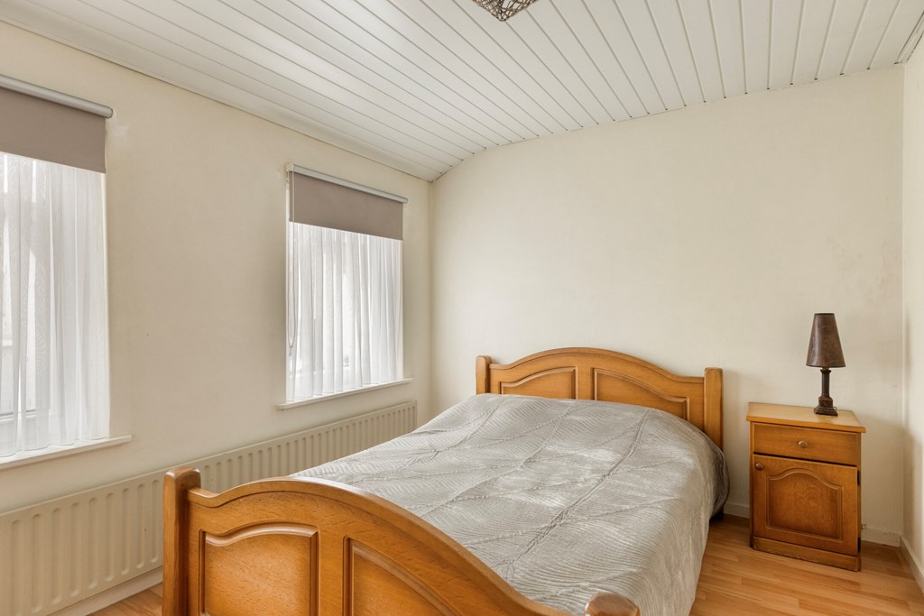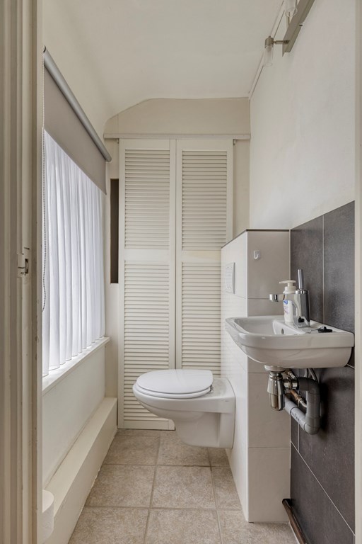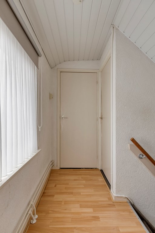 De overloop geeft toegang tot 3 slaapkamers en een toiletruimte met hangend toilet en wastafel. De CV-opstelling (Nefit 2023) is weggewerkt in een inbouwkast. De slaapkamers zijn afgewerkt met een laminaatvloer, granol wanden en een kunststof schroten plafond. Eén slaapkamer is voorzien van een praktische inbouwkast. Via een luik vanuit de kast is de vliering te bereiken. Deze is nu niet in gebruik.