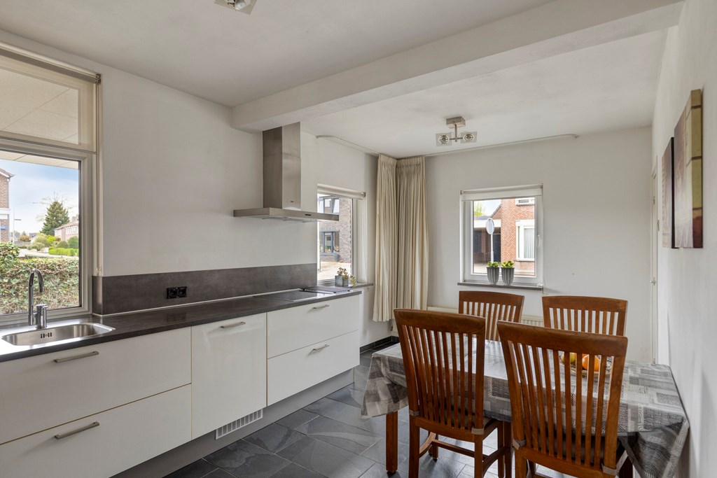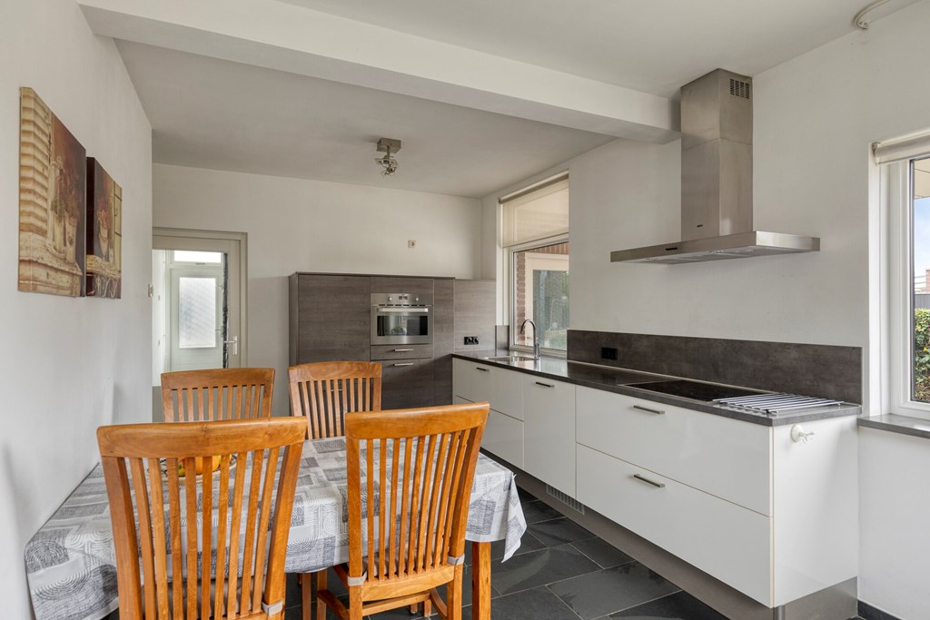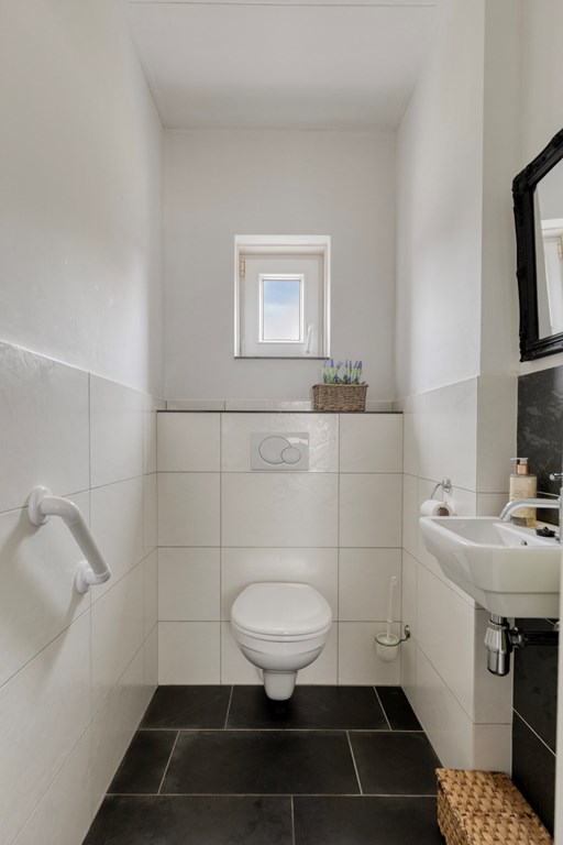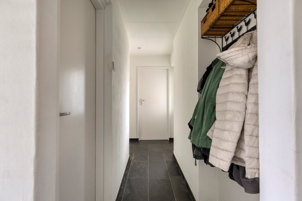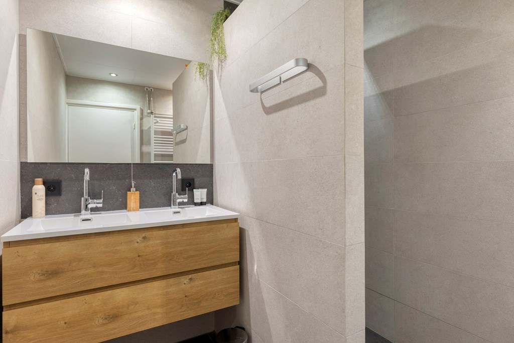 Vanuit de keuken toegang tot de centrale gang met achterdeur naar de tuin en de achterom via de carport. Deze gang geeft toegang tot de toiletruimte met hangend toilet en fonteintje, moderne badkamer met inloopdouche en wandmeubel met dubbele wastafel. Verder is er nog een praktische bijkeuken aanwezig met witgoedaansluitingen en ruimte voor een extra vriezer of koelkast.