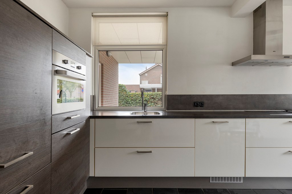Hoofdentree aan de voorzijde van de woning, hal met trapopgang naar de 1e verdieping. Ruime woonkeuken met moderne keukeninrichting in een hoekopstelling en voorzien van inductiekookplaat, afzuigkap, koelkast, oven en vaatwasser. Er is een ruimte voor het plaatsen van een eettafel. De keuken is verder afgewerkt met een tegelvloer, stucwerkwanden en een stucwerkplafond. Dankzij de vele raampartijen is de keuken een enorm lichte ruimte met diverse doorkijkjes naar de omgeving.