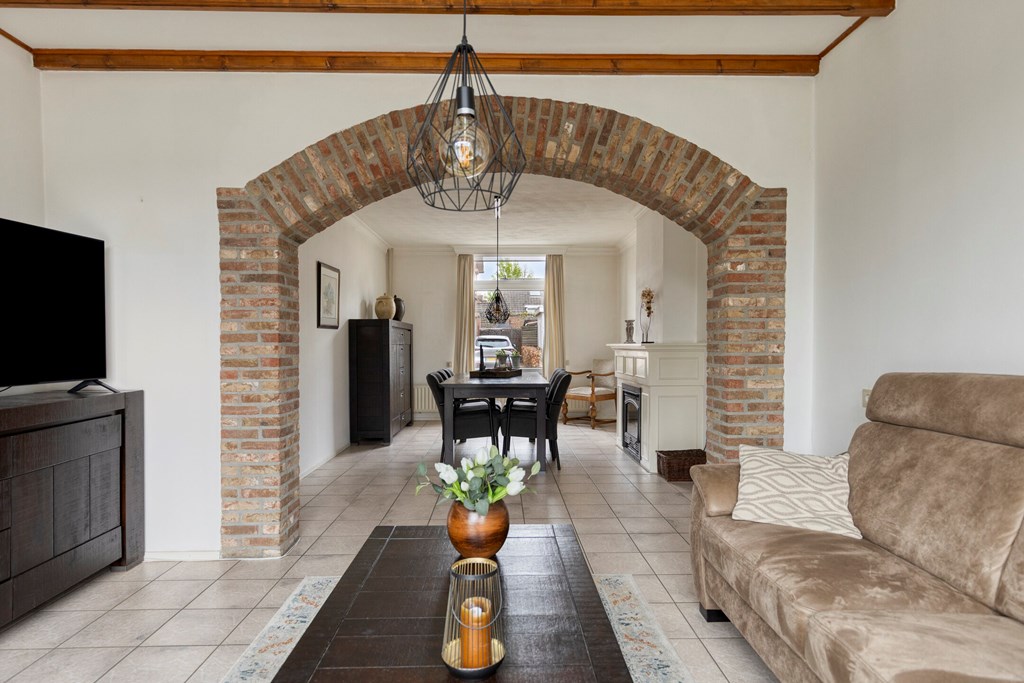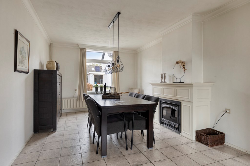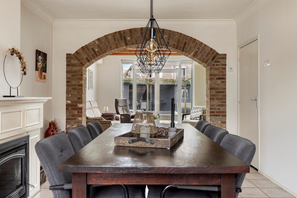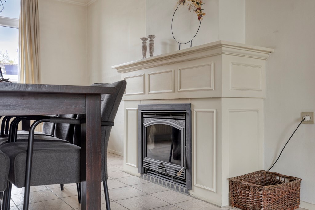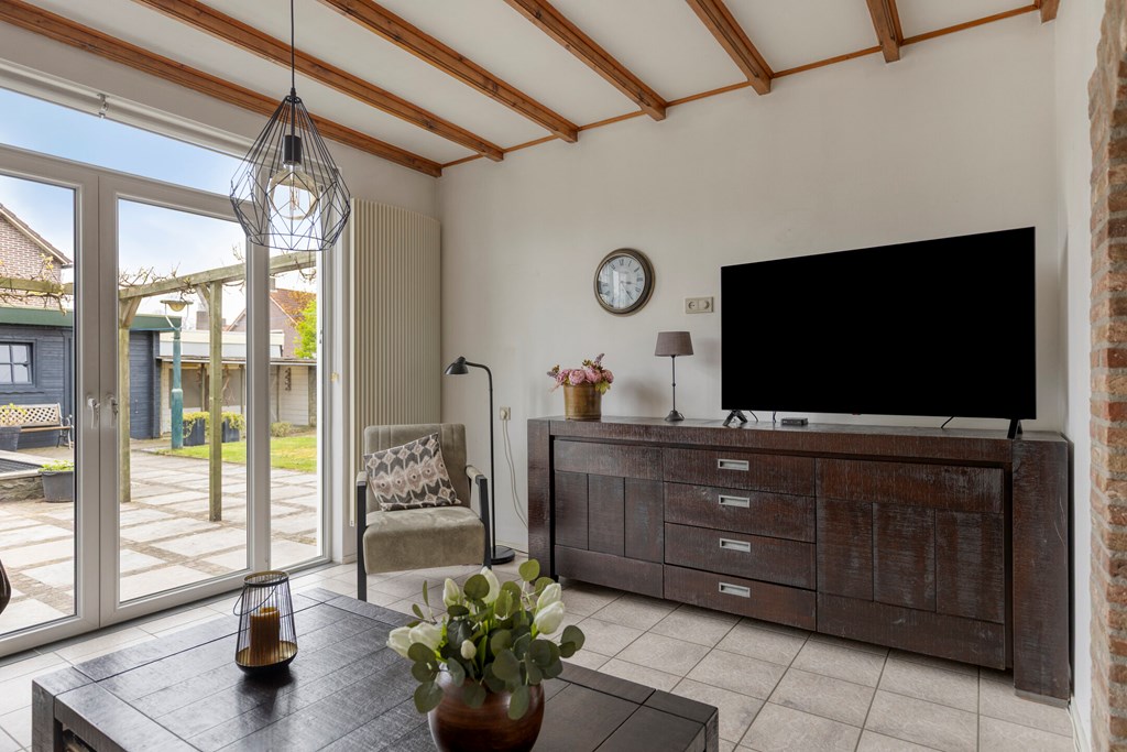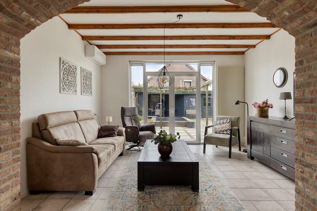 De woonkamer is gelegen aan de andere zijde van de woning en is opgedeeld in een zit- en eetgedeelte. Het zitgedeelte is gelegen in de aanbouw. De woonkamer is afgewerkt met een tegelvloer, spachtelputz wanden en een stucwerkplafond. Er is een sfeervolle schouw met houtkachel aanwezig. Via een gemetselde boog komt je in de zitkamer welke is gelegen in aanbouw. De zitkamer is eveneens afgewerkt met dezelfde tegelvloer en een balkenplafond. Via openslaande deuren toegang tot de tuin.