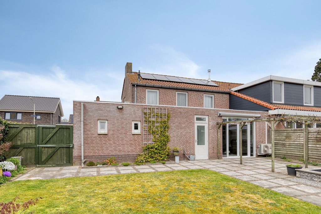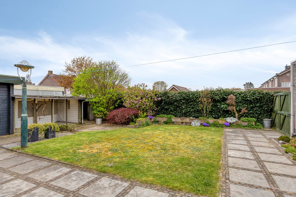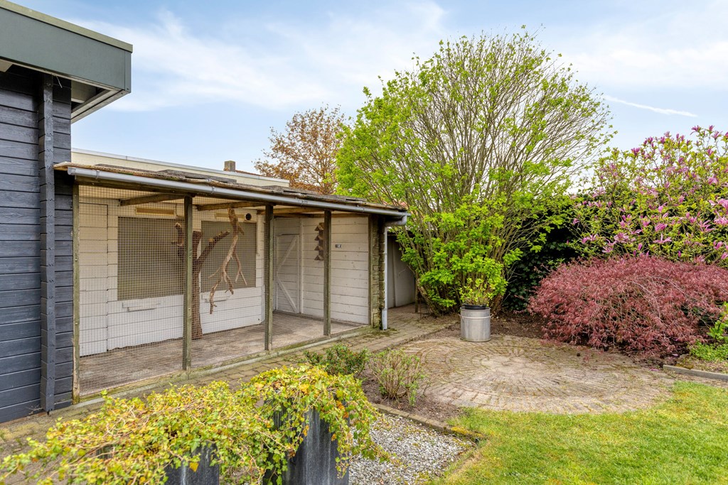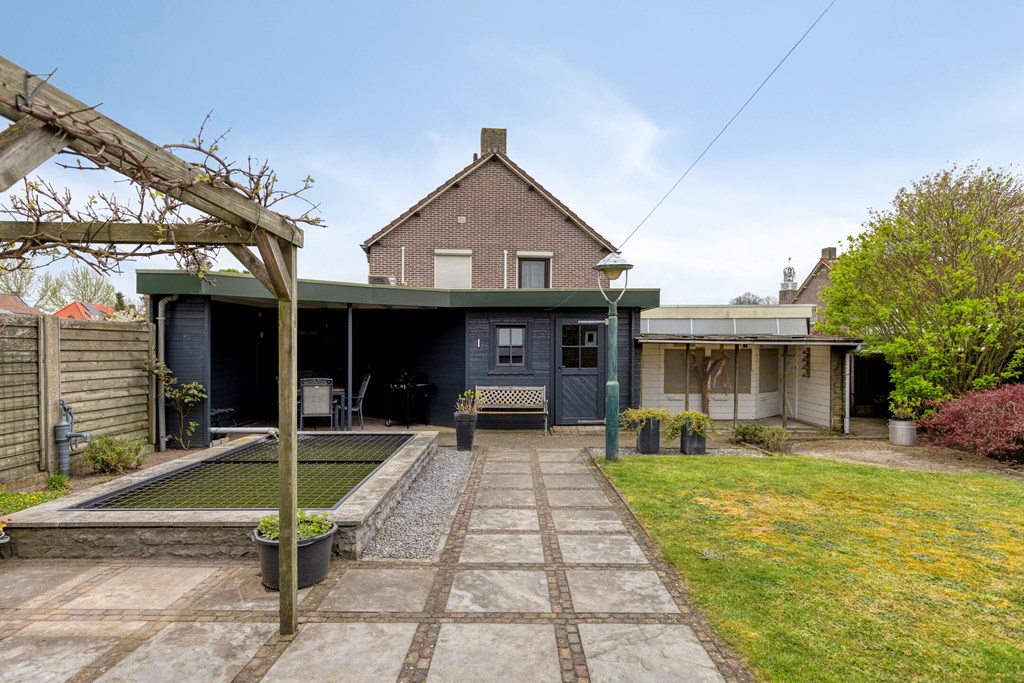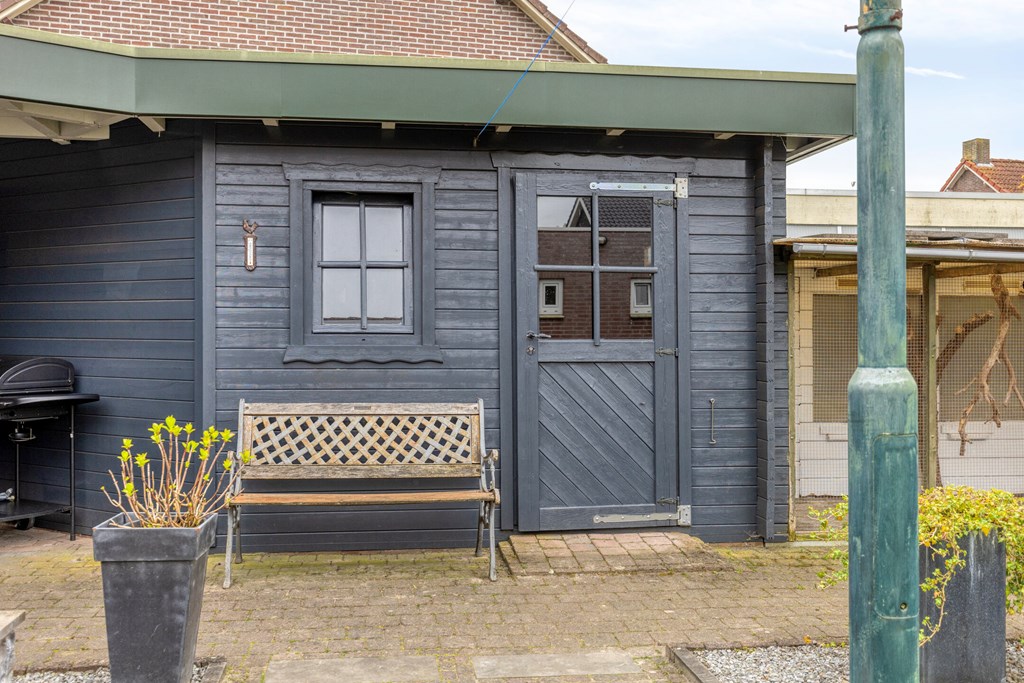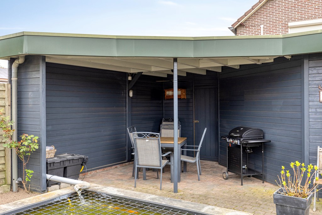De achtertuin is ingericht met bestrating, gazon, een vijver en borders met diverse beplanting. Er is een brede poort aanwezig zodat u met een aanhangwagen de achtertuin kunt bereiken. Er zijn diverse houten bergingen/schuren aanwezig op de achterzijde van het perceel en er is een sfeervolle overkapping aanwezig. De achtertuin is gelegen op het zuiden.