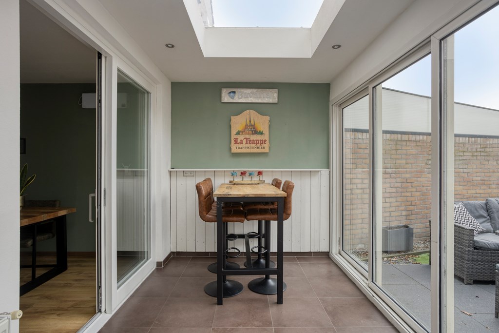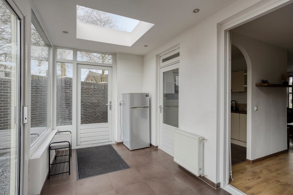 De aangebouwde tuinkamer is bereikbaar via de schuifpui vanuit de eethoek op via de loopdeur vanuit de keuken. De tuinkamer is afgewerkt met een tegelvloer en is een multifunctionele ruimte die gebruikt kan worden voor diverse functies zoals een kantoor, bijkeuken of hobbyruimte. Via een schuifpui vanuit de tuinkamer toegang tot de achtertuin. Via de loopdeur aan de zijkant toegang tot de zijtuin bij de woning.