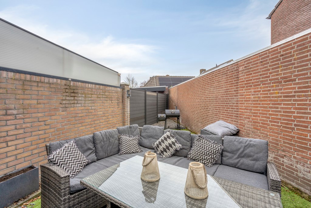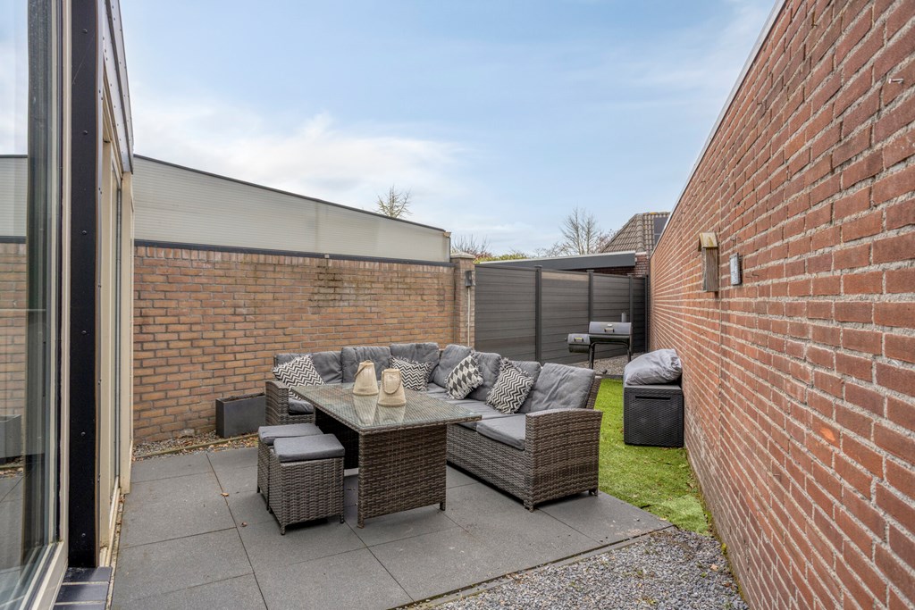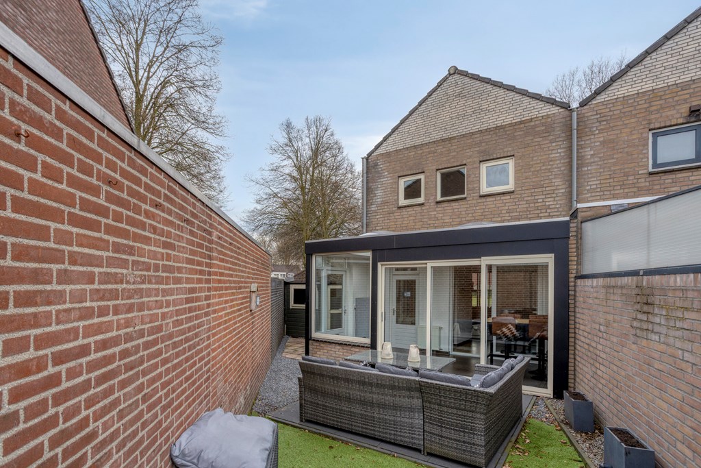 De tuin is opgedeeld in twee gedeelten; de achtertuin en de zijtuin. De achtertuin is onderhoudsvriendelijk aangelegd met bestrating en kunstgras gazon. De achtertuin biedt veel privacy en is gelegen op het noorden. De zijtuin is gelegen naast de woning en hier is een ouder tuinhuisje aanwezig en verder is er een achterom aanwezig.