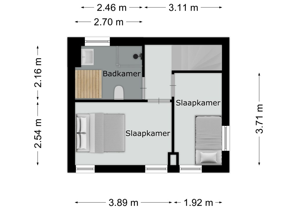De overloop geeft toegang tot 2 slaapkamers en de complete en moderne 2e badkamer ingericht met een inloopdouche, wandmeubel met wastafel, hangend toilet en sauna. Verder is er een grote en kleine slaapkamer aanwezig op de verdieping; ideaal voor een thuiswonend kind of logeerkamers voor (klein)kinderen. De slaapkamers zijn afgewerkt met een laminaatvloer, stucwerkwanden en een spuitwerkplafond.