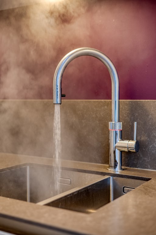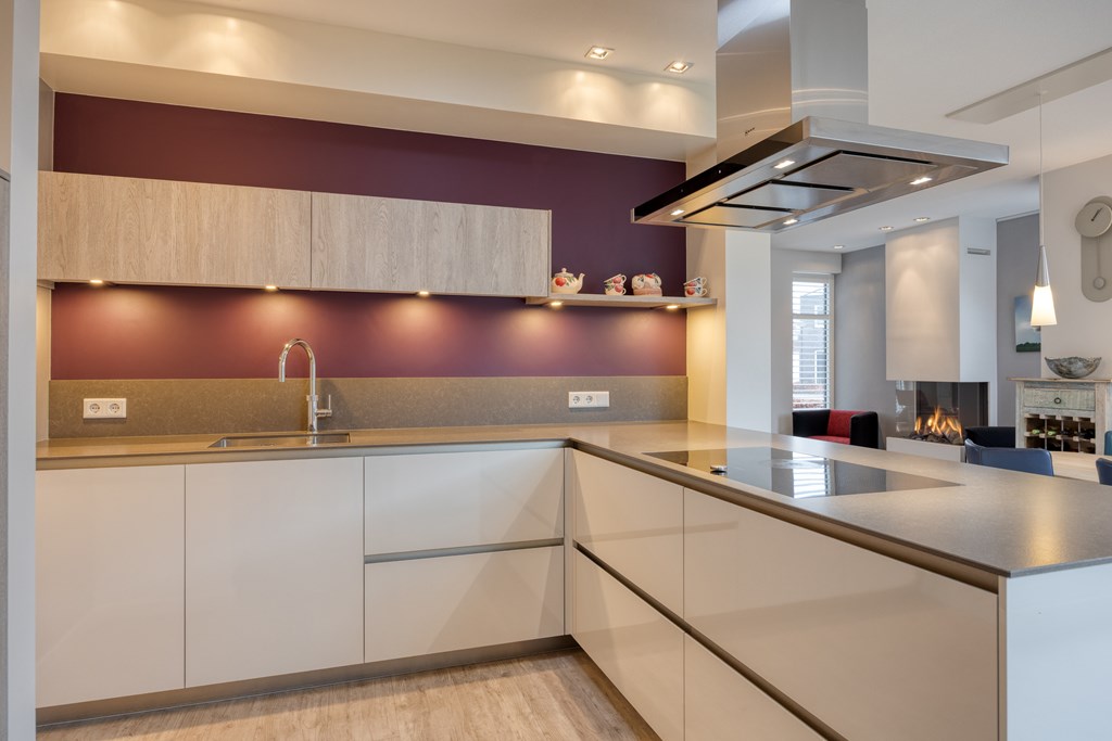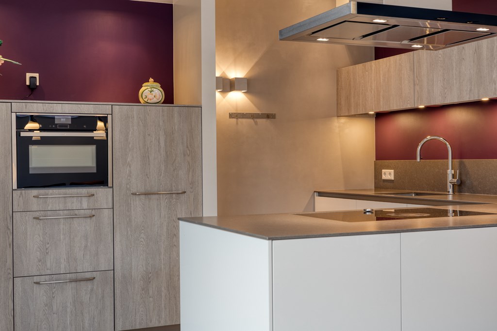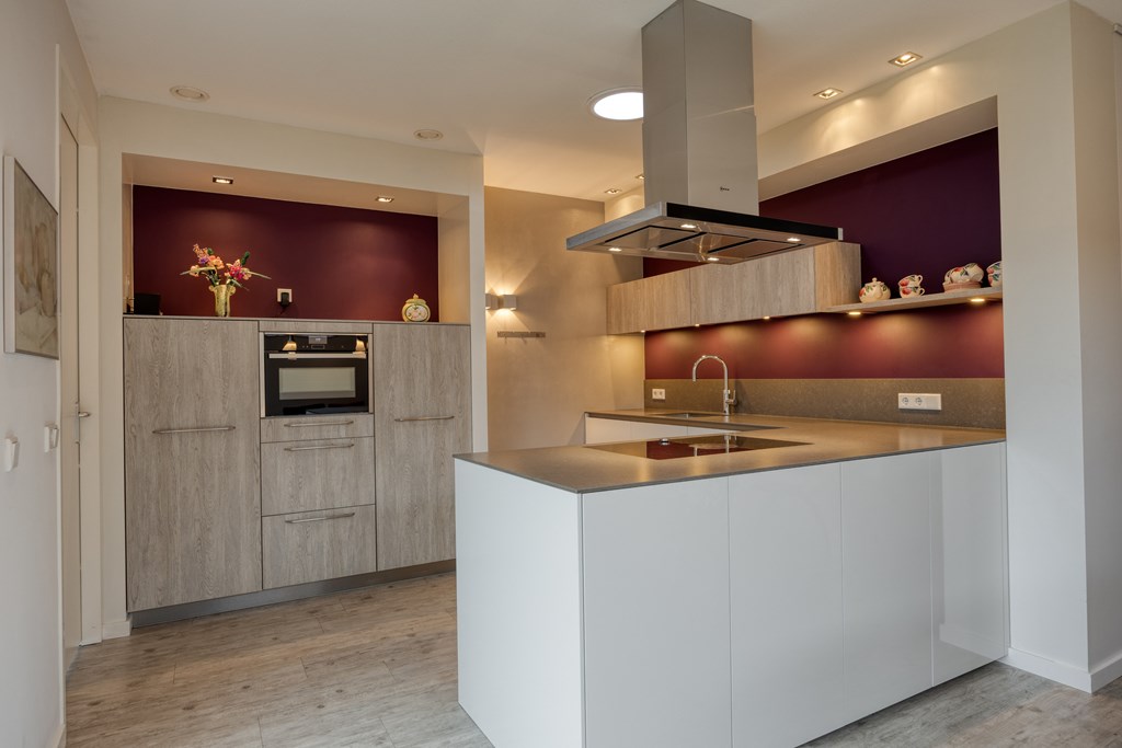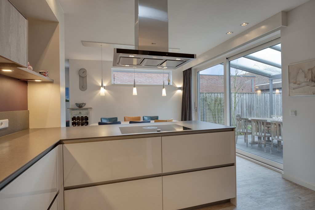 De keuken is gelegen aan de achterzijde van de woning met zicht op de tuin. Moderne en degelijke keukeninrichting geplaatst in een hoekopstelling met schiereiland en afgewerkt met een composiet aanrechtblad. Er is een wandopstelling met combi-oven en koelkast. Daarnaast bevindt zich nog een inductiekookplaat, vaatwasser en afzuigkap in de hoofd keukengedeelte. Verder is de keukenwand en betimmering sfeervol en luxe afgewerkt met strakke stucwerkwanden met inbouwspots.