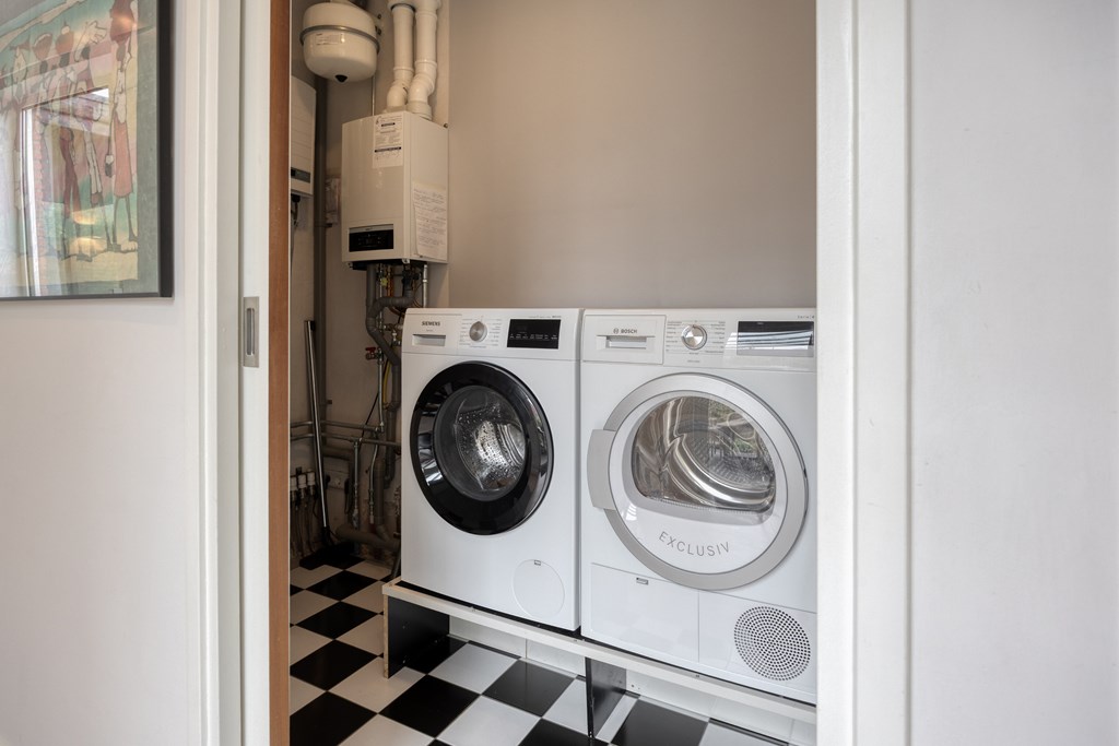 Praktische technische- en wasruimte met witgoedaansluitingen, gasgestookte CV-ketel (2016), omvormer en WTW-systeem in de woning.