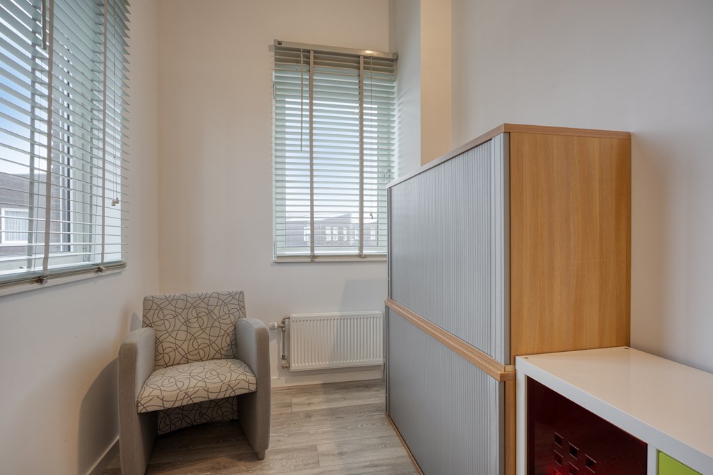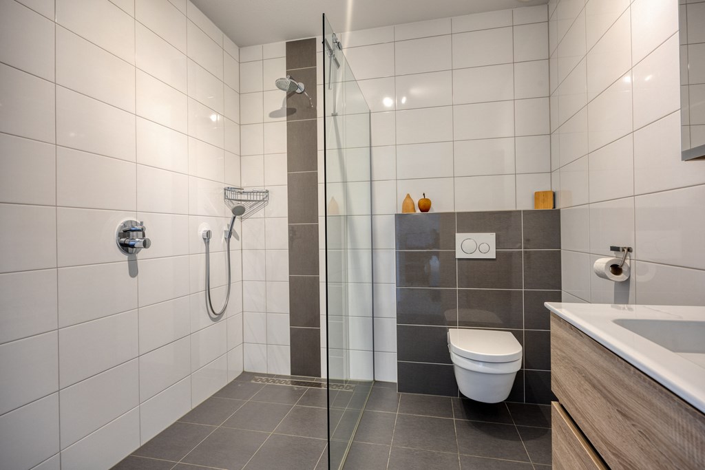 Ruime ouderslaapkamer afgewerkt met een pvc-vloer, stucwerkwanden en een stucwerkplafond. De vaste kledingkast blijft achter in de woning. Vanuit de badkamer toegang tot de badkamer en-suite afgewerkt met een neutrale kleurstelling met ruime inloopdouche, wandmeubel met wastafel en hangend toilet.
