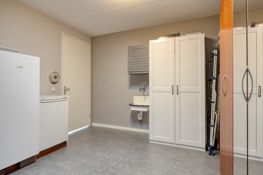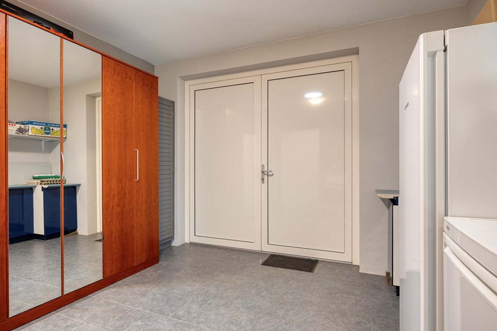 Vanuit de keuken toegang tot het portaal met achterdeur naar de tuin. Het portaal geeft verder toegang tot de garage/berging, technische/wasruimte en de ouderslaapkamer. De praktische garage/berging is afgewerkt met een tegelvloer en stucwerkwanden- en plafond. Dubbele openslaande aluminium deuren in de voorgevel van de garage/berging naar de oprit.