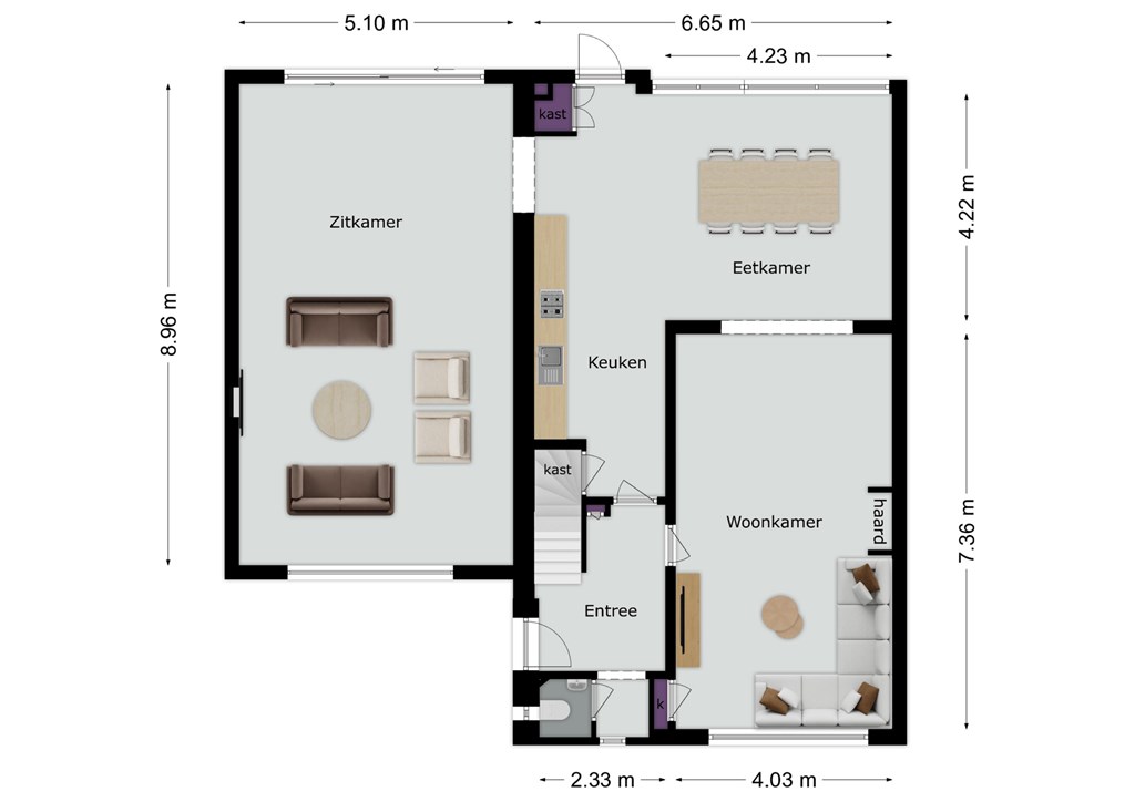Entree aan de voorzijde met ruime hal, trapopgang, meterkast, garderobe en toilet.