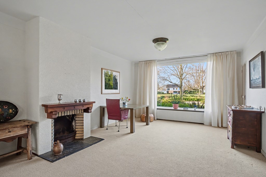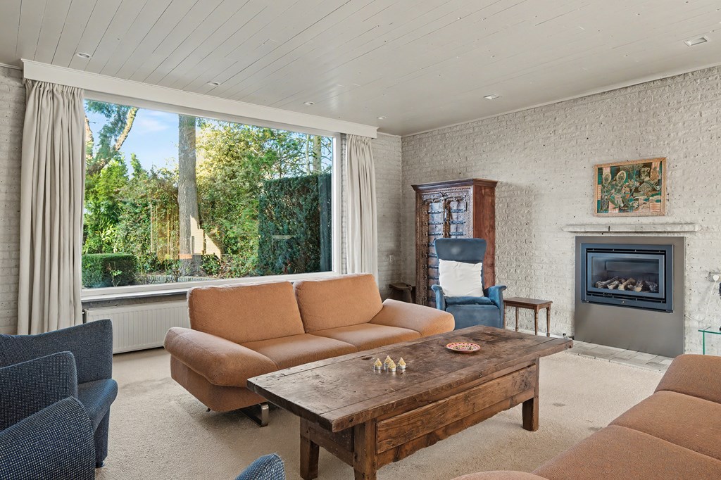Woonkamer met schouw en prachtig uitzicht op het park.