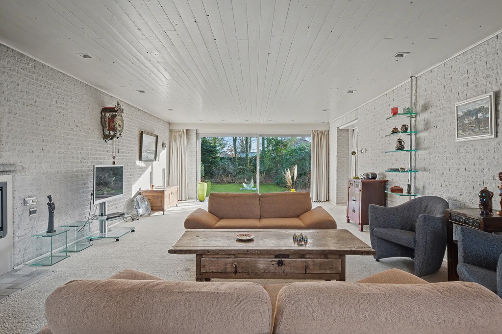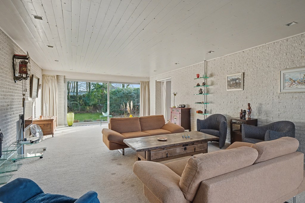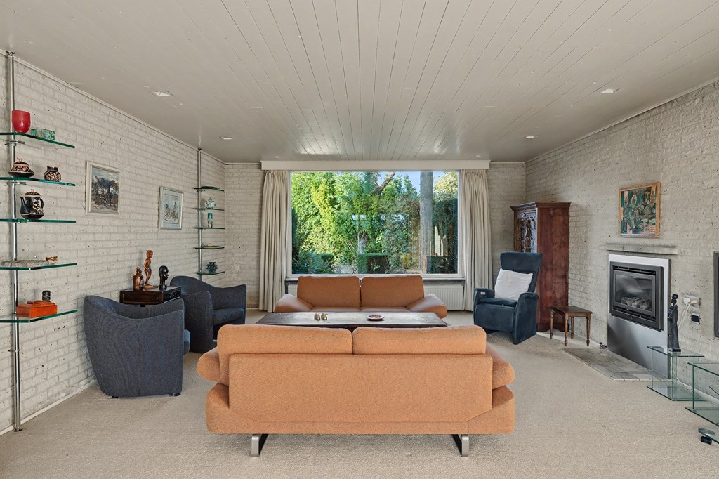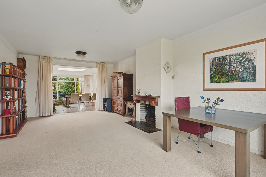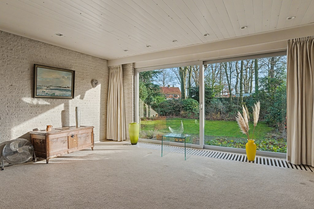 Vanuit de leefkeuken toegang tot de grote aanbouw aan de zijkant van de woning. Deze is op dit moment ingericht als riante woonkamer (45 m²) met aluminium pui, gashaarden ook hier een fraai uitzicht op het park en de achtertuin. Er zijn legio gebruiksmogelijkheden voor deze enorme ruimte.