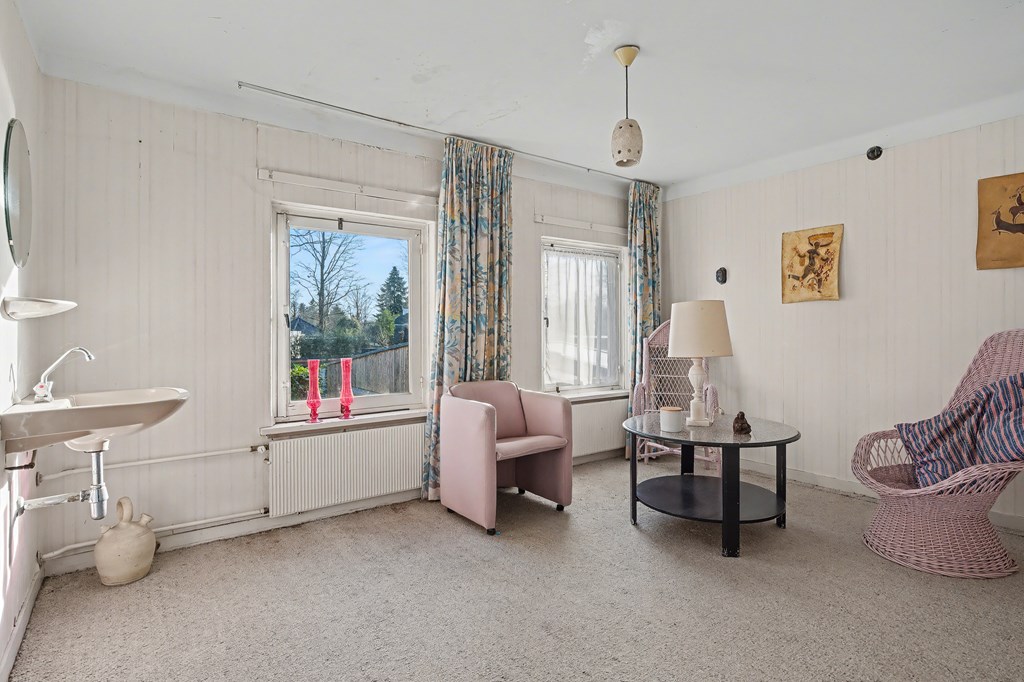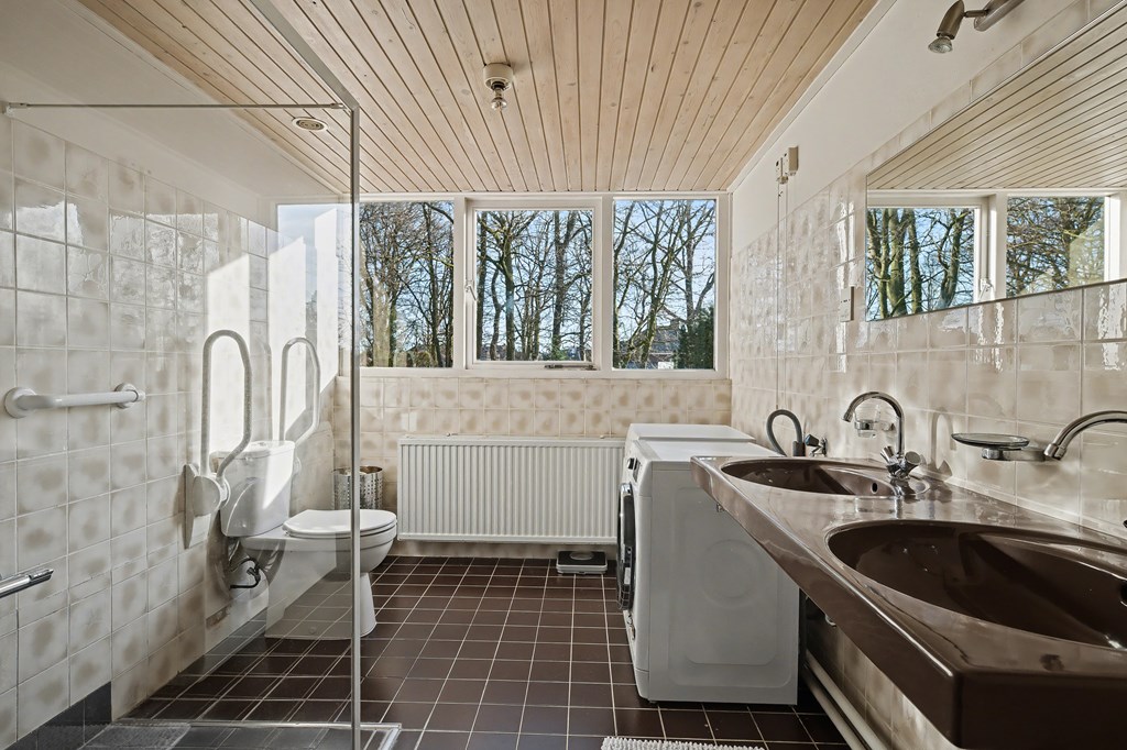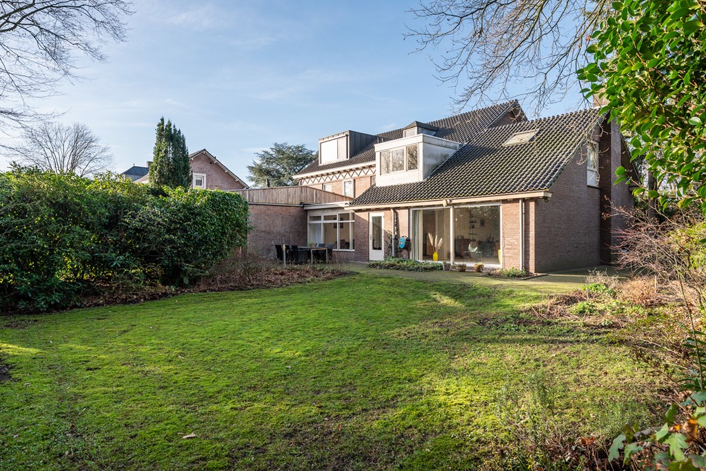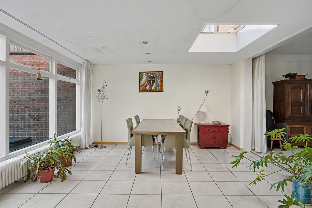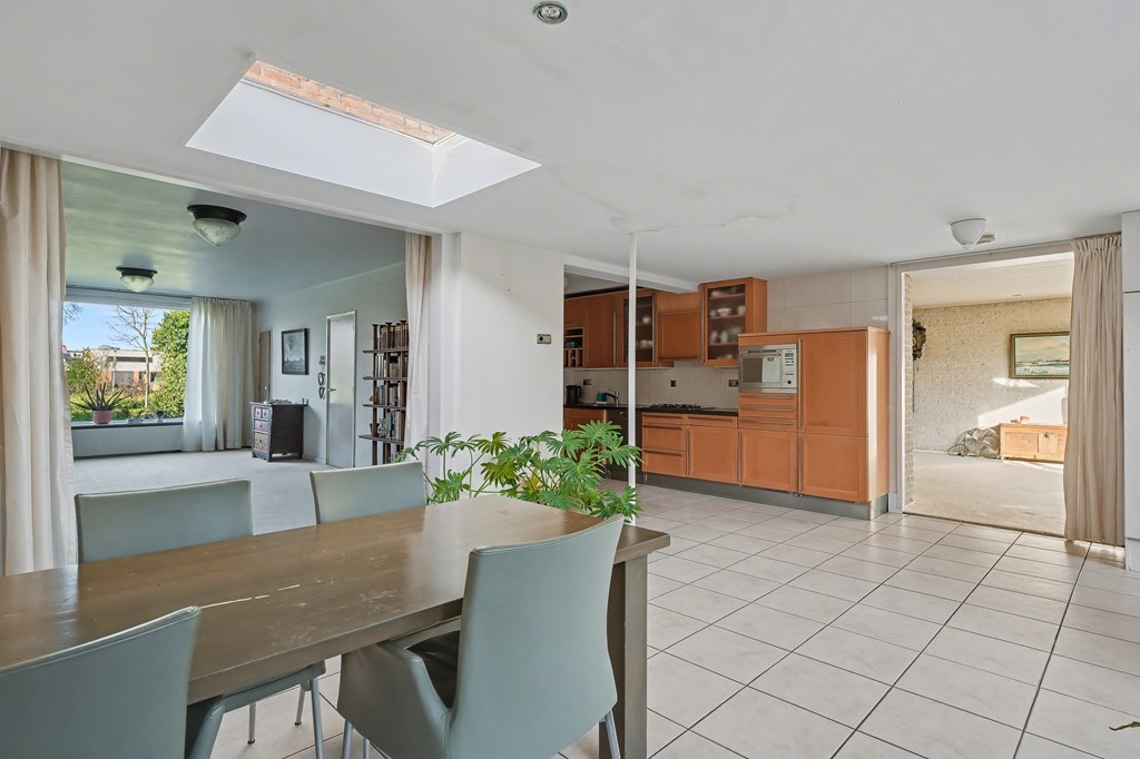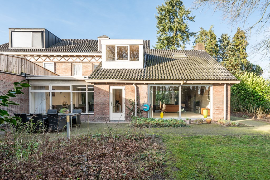 Vanuit de leefkeuken toegang tot de grote aanbouw aan de zijkant van de woning. Deze is op dit moment ingericht als riante woonkamer (45 m²) met aluminium pui, gashaarden ook hier een fraai uitzicht op het park en de achtertuin. Er zijn legio gebruiksmogelijkheden voor deze enorme ruimte.