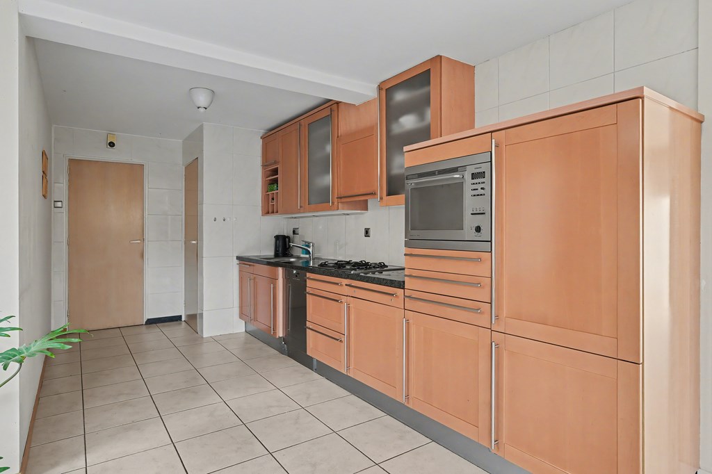 Royale woonkeuken met achteringang en bergkasten. Voorzien van een beukenhouten keuken inrichting in lengte opstelling met diverse onder-, bovenkasten en lades. Een granieten blad en diverse apparatuur. Naast de keuken ligt een verdiepte kelderkast.