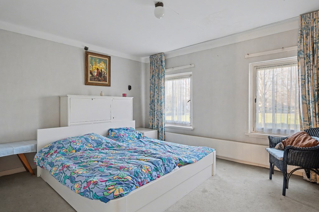 De eerste verdieping beschikt over vier slaapkamers en een badkamer. De slaapkamers hebben goede afmetingen maar vooral de ouderslaapkamer (gelegen op de 1e verdieping van de aanbouw) is zeer ruim. De betegelde badkamer heeft een grote dakkapel, is goed van afmeting, maar behoeft enige modernisering.