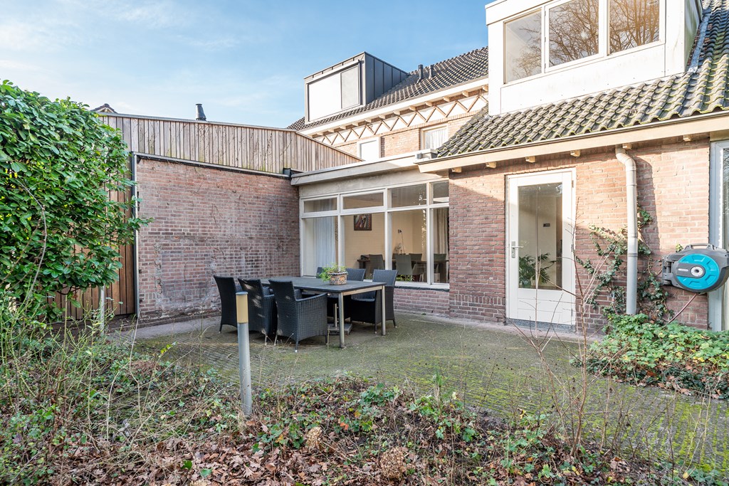 De verrassend ruime achtertuin is ingericht met bestrating, gazon, borders, diverse volwassen bomen, buitenverlichting, een heerlijk zonnig terras en een vrije achterom.
