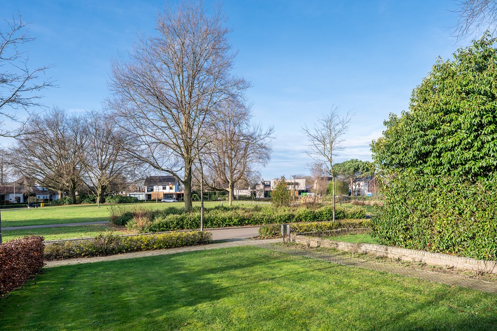 Woonkamer met schouw en prachtig uitzicht op het park.