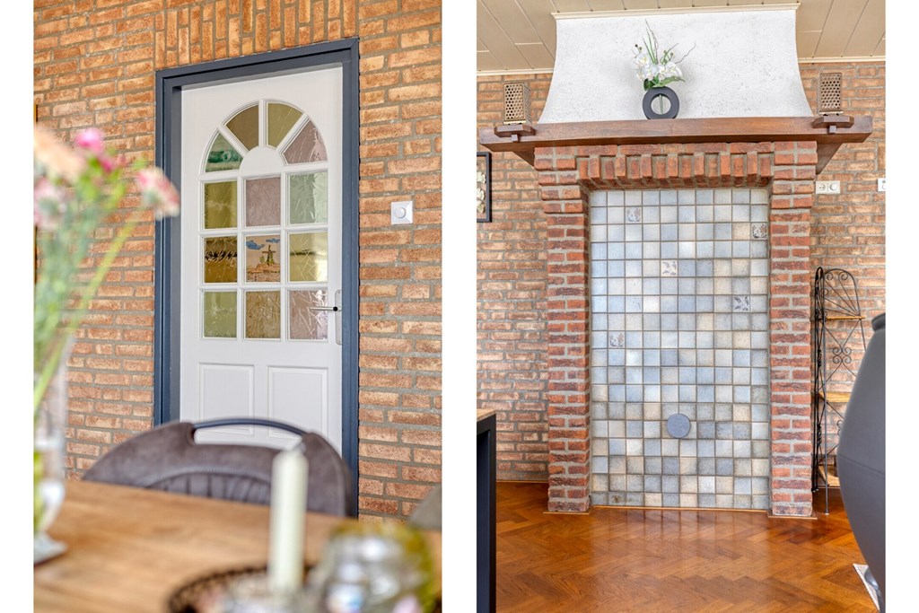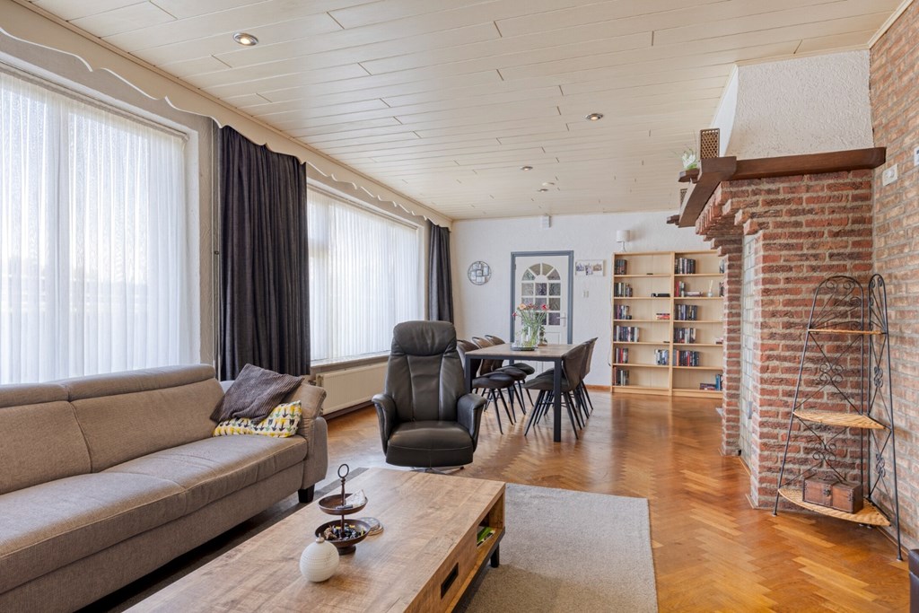 Hoofd entree aan de voorzijde van de woning, brede en ruime hal met meterkast en trapopgang naar de 1e verdieping. Vanuit de hal toegang tot de woonkamer aan de voorzijde van de woning. Een mooie grote ruimte met hoge plafonds en een stenen schouw met aansluiting voor de realisatie van een haard. De woonkamer is verder afgewerkt met een visgraat parketvloer, deels granol- en deels schoonmetselwerk wanden en een mdf-schroten plafond met inbouwspots. Grote raampartijen aan de voorzijde met triple beglazing; totaal geen geluid van de omgeving komt hier binnen. De muren aan de voorzijde zijn ook extreem dik: in het midden een steense muur met een halfsteense muur voor – en achter deze steense muur.