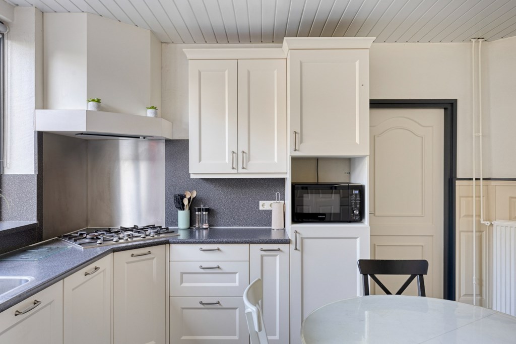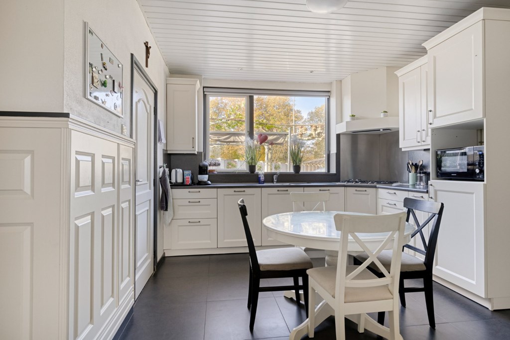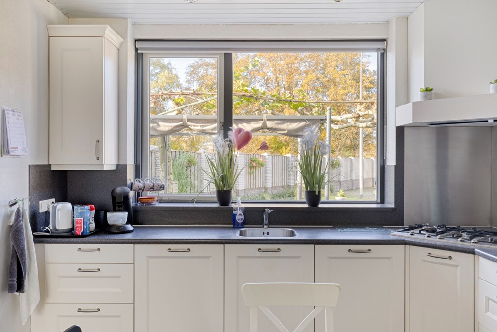 Vanuit de woonkamer toegang tot de leefkeuken met kunststof keuken in een hoekopstelling ingericht met gaskookplaat, afzuigkap, vaatwasser, koelkast en diverse boven- on onderkasten. De keuken is afgewerkt met een tegelvloer , deels lambrisering wanden en een kunststof schroten plafond. Vanuit het grote raam mooi zicht op de achtertuin.