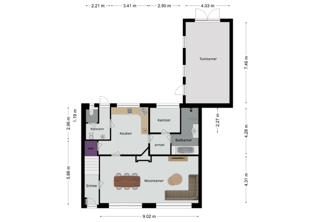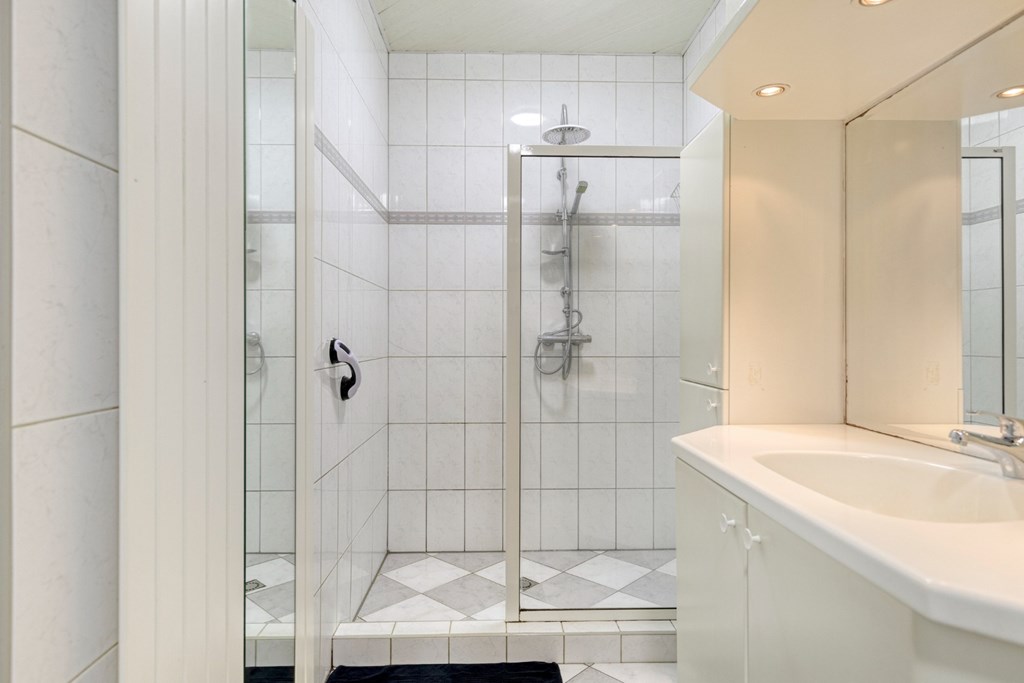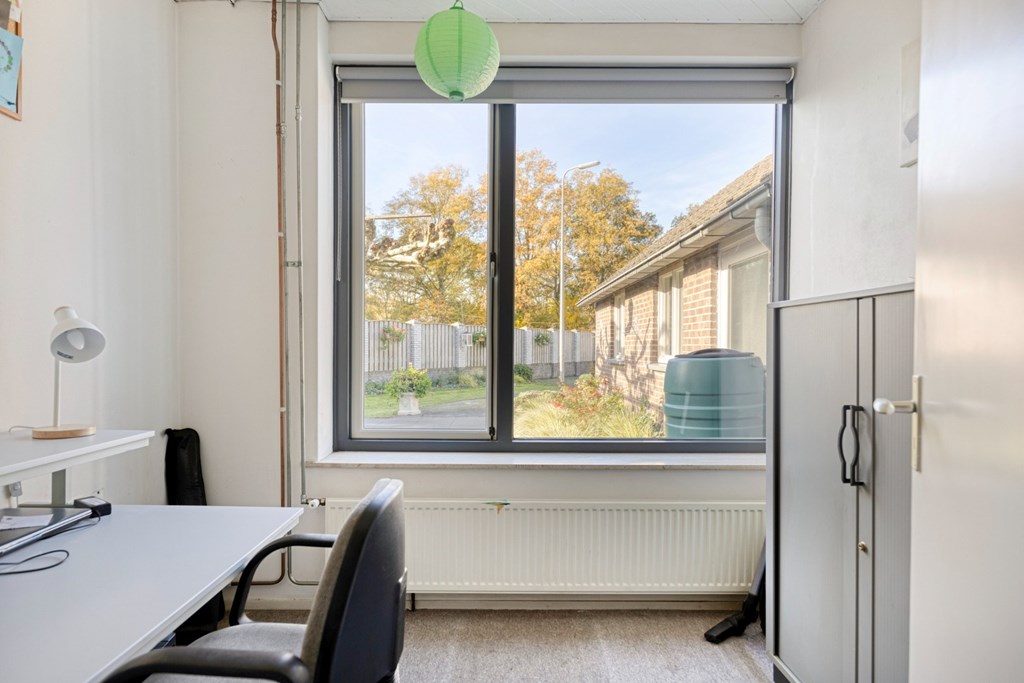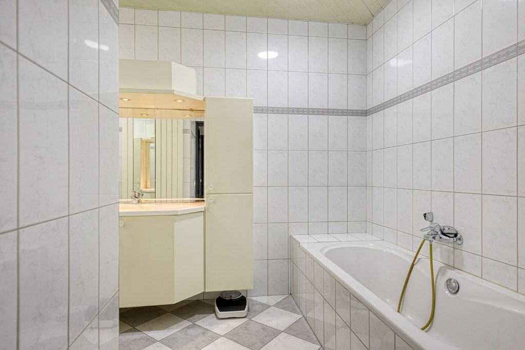 Via een deur toegang tot de voorraadkast. Vanuit de keuken toegang tot het portaal dat weer toegang biedt tot de kantoorruimte en badkamer. De betegelde badkamer is in 1997 vernieuwd en is ingericht met een ruime inloopdouche, ligbad en wandmeubel met wastafel.