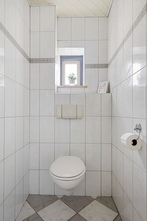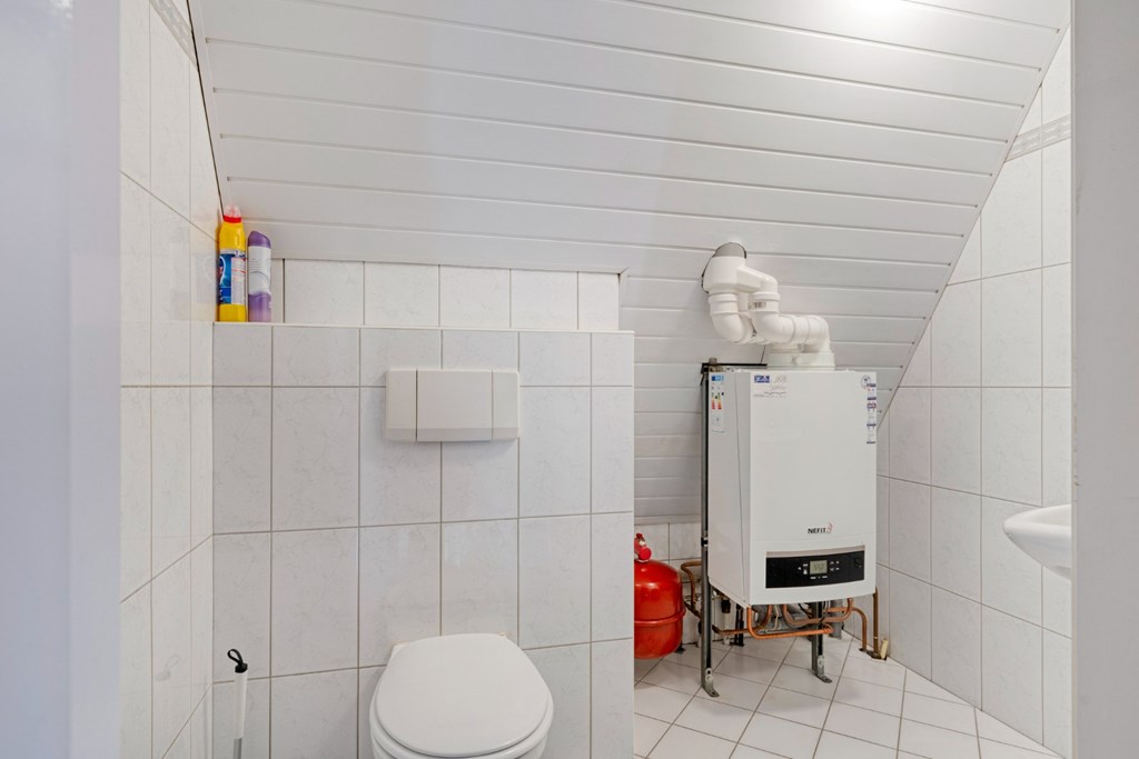 Praktische bijkeuken met witgoedaansluitingen en achterdeur naar de tuin. Verder is hier de geheel betegelde toiletruimte met hangend toilet aanwezig.