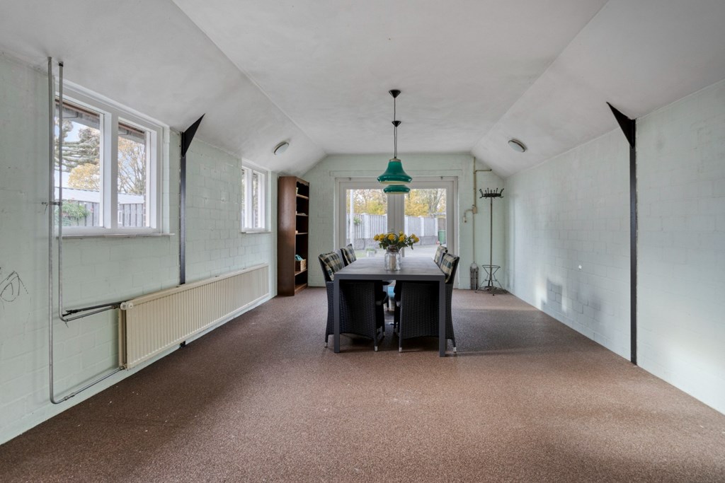 De achtertuin is ingericht met bestrating, gazon en diverse beplantingen en enkele bomen. De tuin biedt zeer veel privacy en vrijheid. De tuin is gelegen op het zuidwesten. Vanuit de achtertuin toegang tot de aangebouwde tuinkamer. Een grote ruimte van 4.0 m x 7.46m die op diverse manieren gebruikt kan worden. Er kan een doorgang worden gecreëerd naar het woonhuis waardoor de uitbouw inpandig te bereiken is. De aanbouw dateert van 1980 en is geïsoleerd en verwarmd via radiatoren.