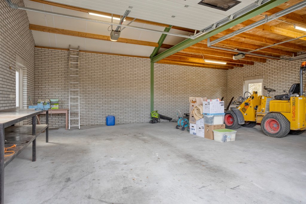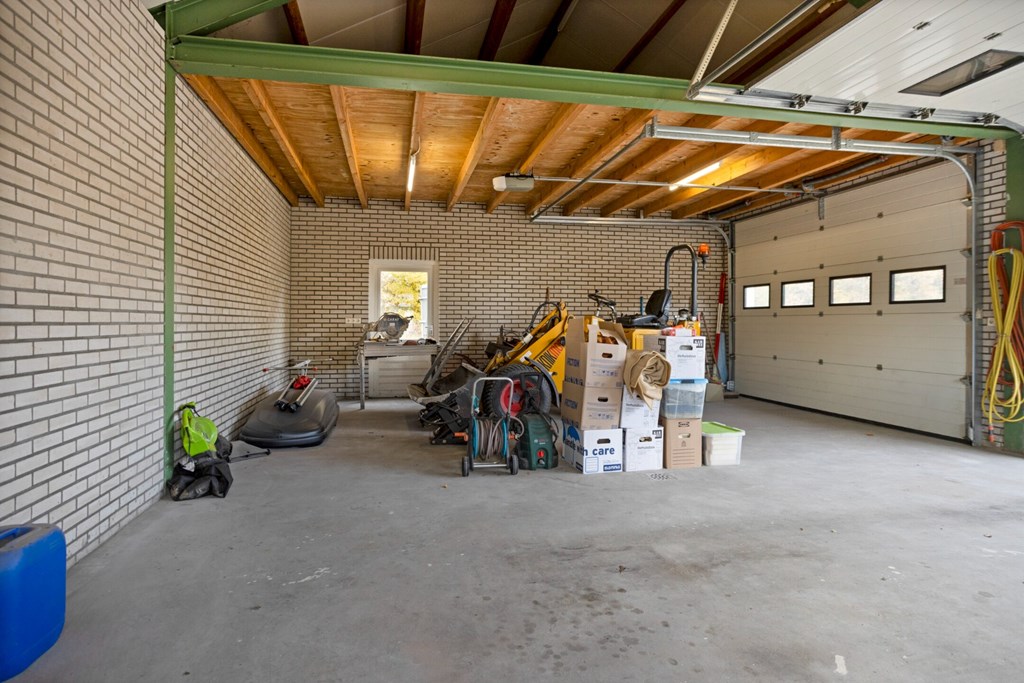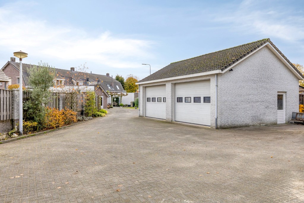 De moderne garage is gebouwd in 2002 en is opgetrokken uit spouwmetselwerk met hout-/stalen kapconstructie met isolatieplaten dakbeschot en het dak is gedekt met betonpannen. Verder is de garage afgewerkt met schoonmetselwerkwanden en een gevlinderd en geïsoleerde betonvloer. Twee grote elektrische sectionaal deuren in de voorgevel van de garage. De afmetingen van de garage zijn 6,78m x 9,39m (binnenwerks). Er is nog een overkapping gemaakt aan de zijgevel van de garage voor opslag van materialen en verder is er in de garage een grote zolder voor opslag aanwezig.