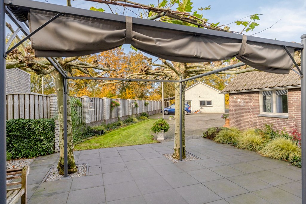 De achtertuin is ingericht met bestrating, gazon en diverse beplantingen en enkele bomen. De tuin biedt zeer veel privacy en vrijheid. De tuin is gelegen op het zuidwesten. Vanuit de achtertuin toegang tot de aangebouwde tuinkamer. Een grote ruimte van 4.0 m x 7.46m die op diverse manieren gebruikt kan worden. Er kan een doorgang worden gecreëerd naar het woonhuis waardoor de uitbouw inpandig te bereiken is. De aanbouw dateert van 1980 en is geïsoleerd en verwarmd via radiatoren.