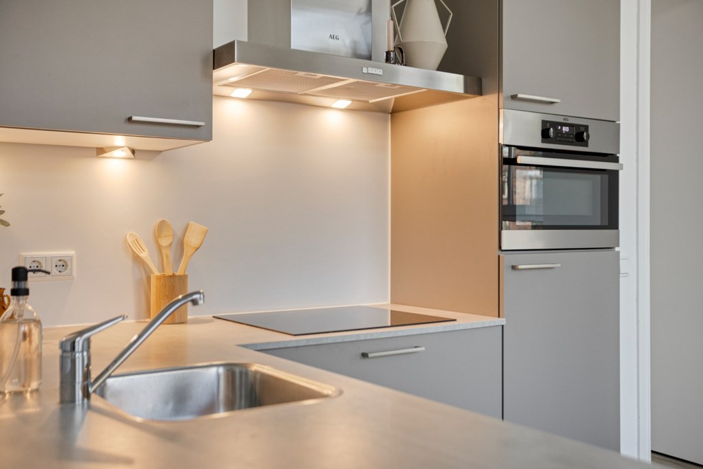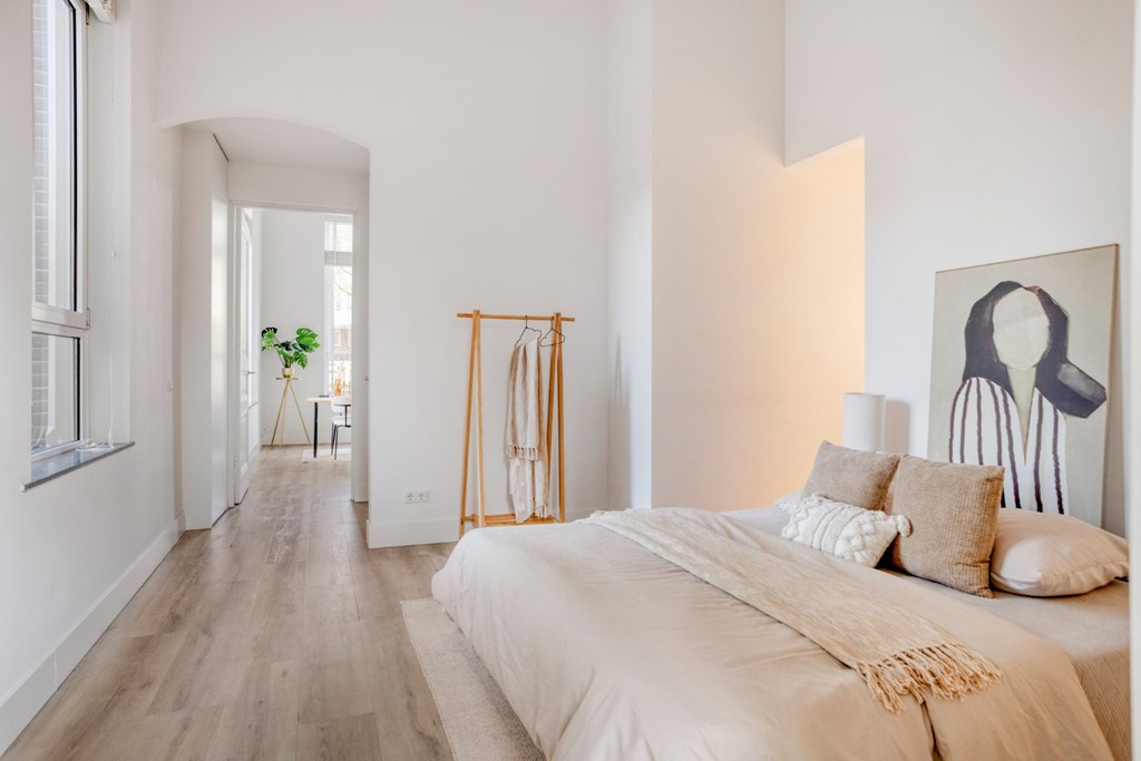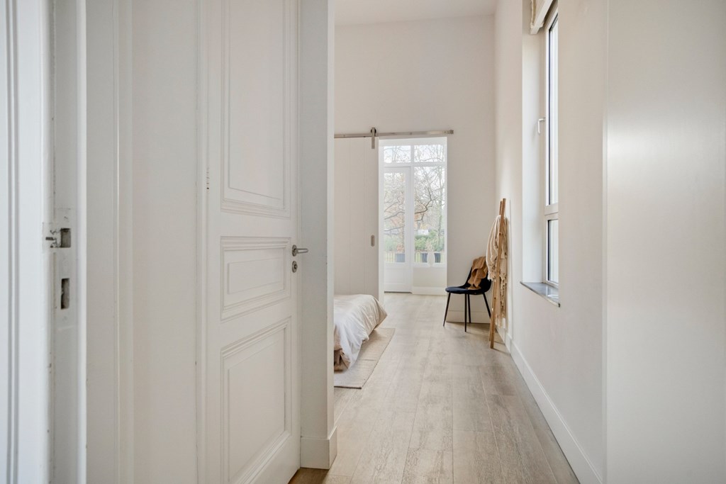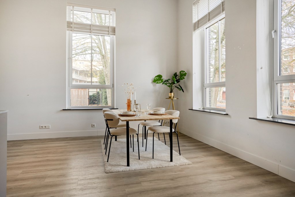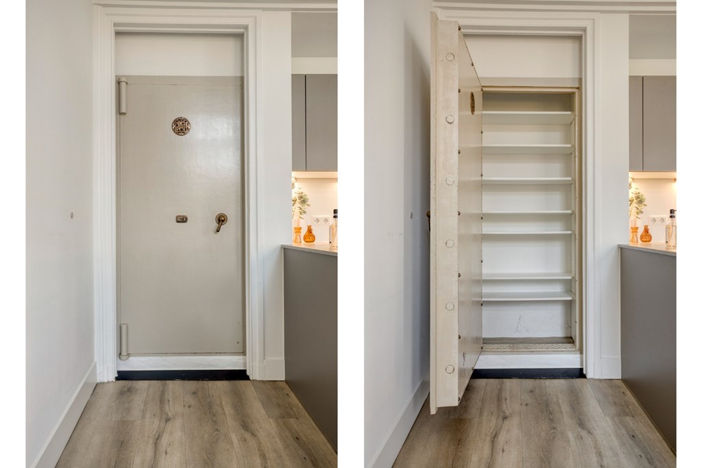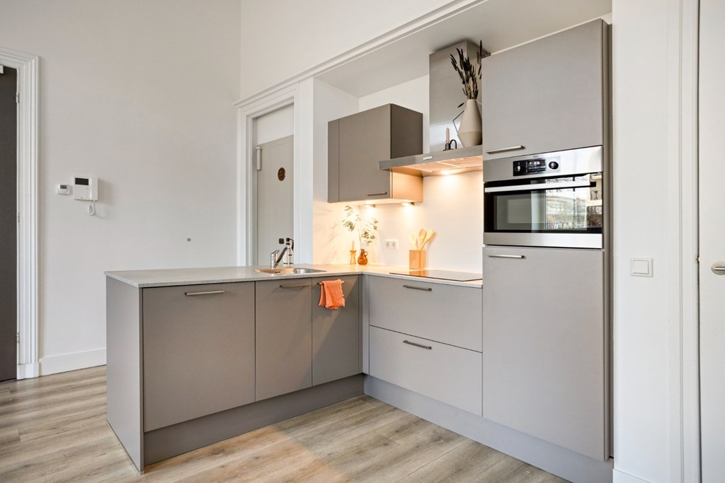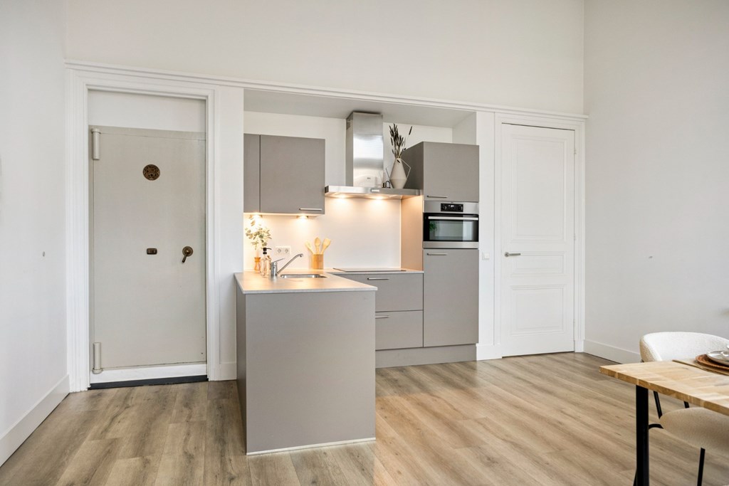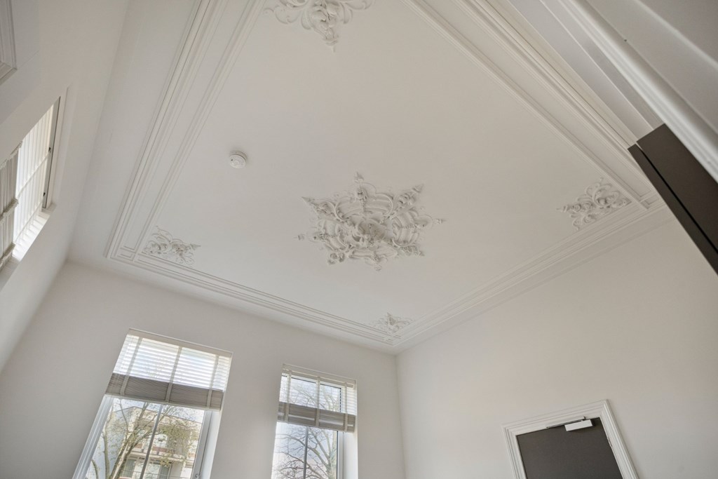 De keukenruimte is afgewerkt met een pvc-vloer die doorloopt door het gehele appartement en is voorzien van vloerverwarming. Verder zijn alle wanden en plafonds strak gestuct en de oude sierlijke ornamenten in het plafond zijn bewaard gebleven en gerestaureerd.