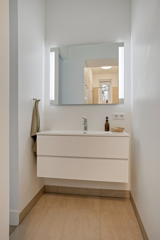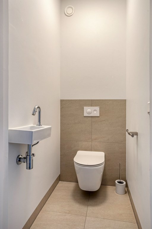 Via een doorgang toegang tot de ouderslaapkamer. In de doorgang is een moderne toiletruimte gerealiseerd met hangend toilet en fonteintje. De ouderslaapkamer is een grote slaapkamer met inloopkast en badkamer en-suite met wandmeubel met wastafel en inloopdouche.