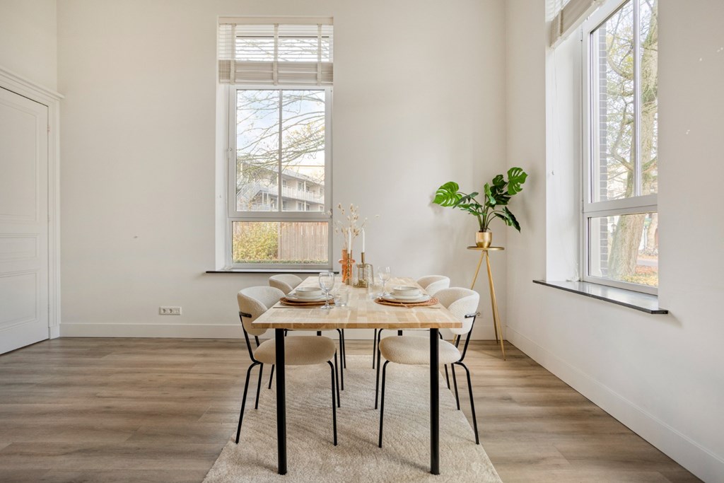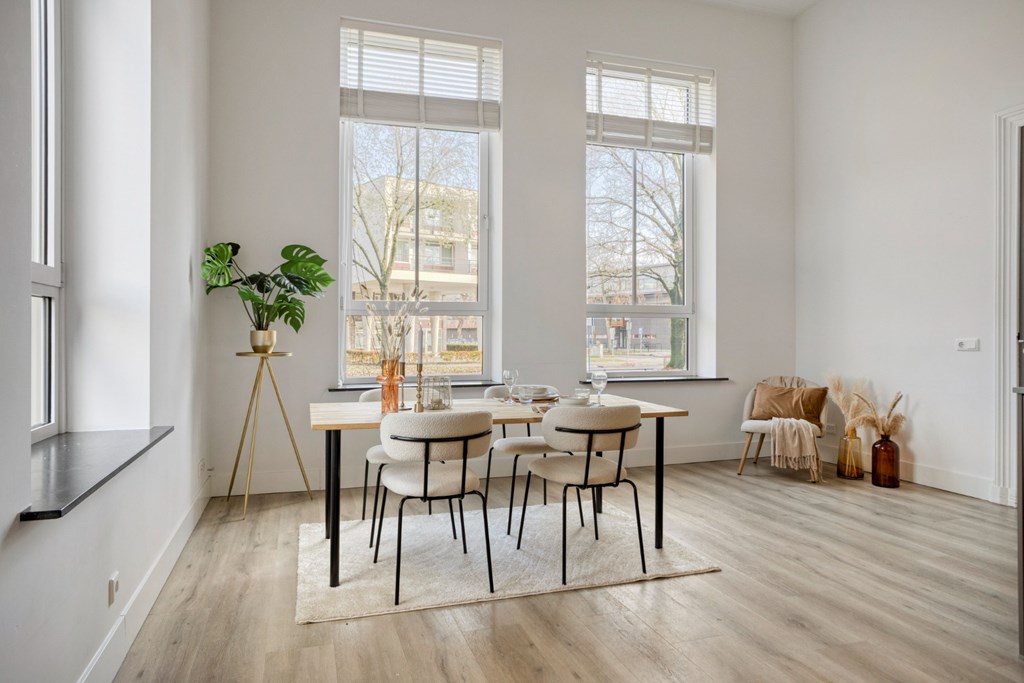 Via de centrale gang op de begane grond toegang tot het appartement. Wat meteen opvalt is de hoogte van de plafonds. De hoge plafonds en de ramen geven het appartement extra uitstraling en een gevoel van ruimte en licht. U betreedt het appartement in de ruime leefkeuken.