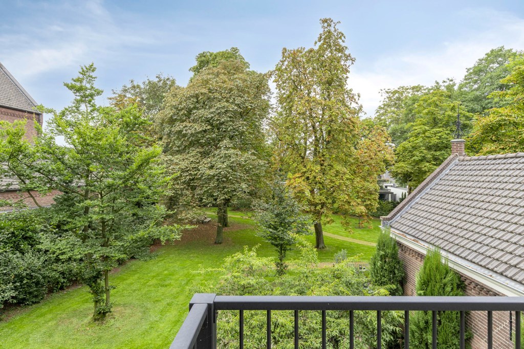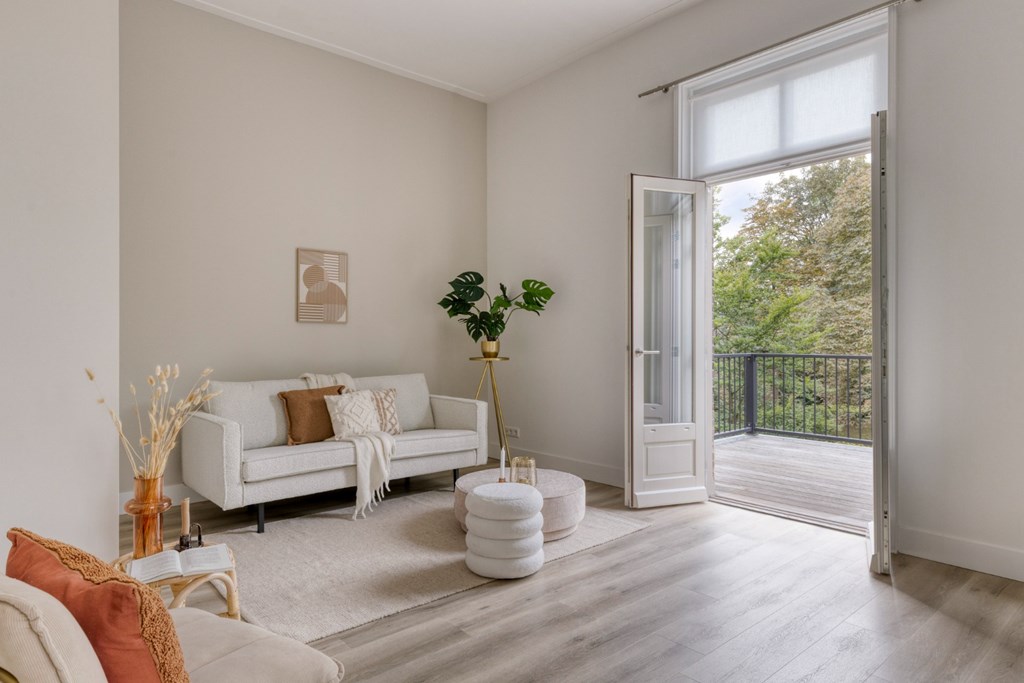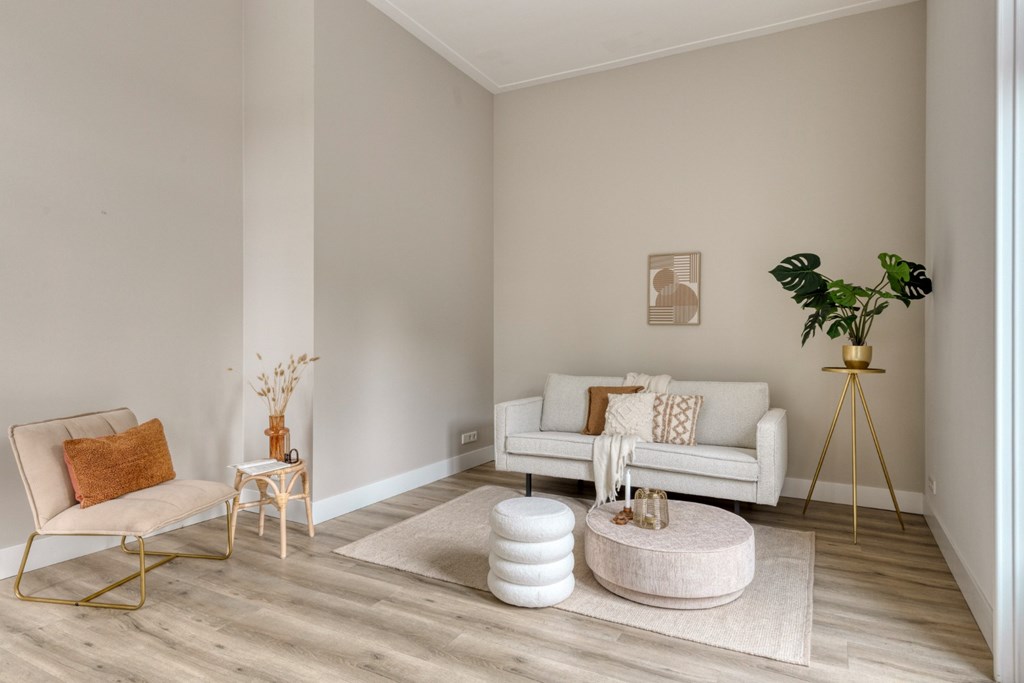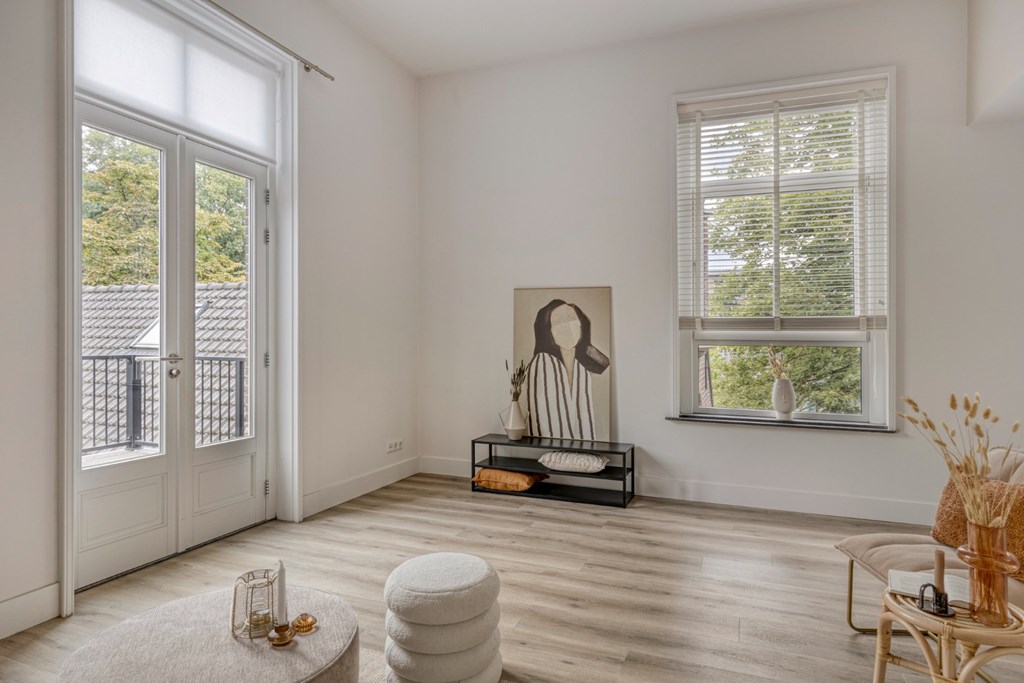 De woonkamer biedt de ruimte veel het realiseren van een gezellige zithoek en eventueel nog een werkplek. Het geheel is afgewerkt met een pvc-vloer en strakke stucwerk wanden- en plafonds. Vanuit de woonkamer toegang tot het ruime balkon aan de achterzijde van het appartement met prachtig zicht op de prachtige tuin van de pastorie.