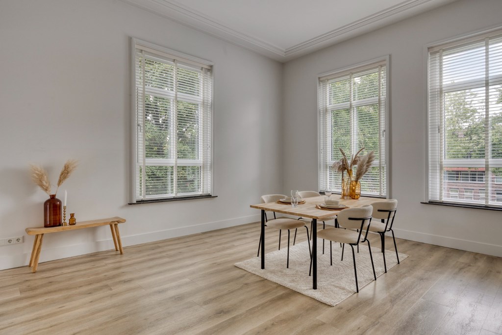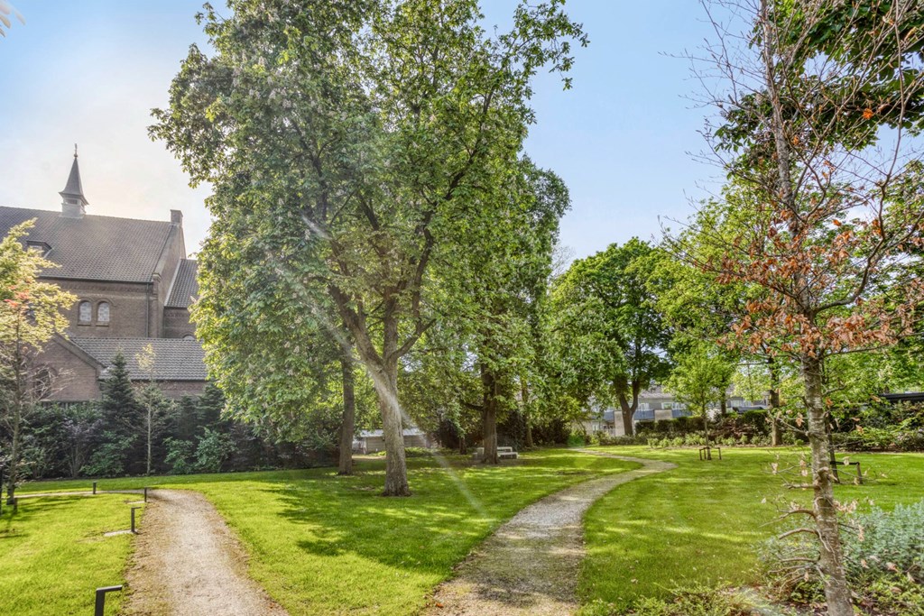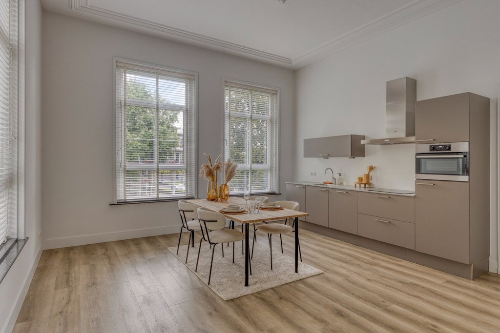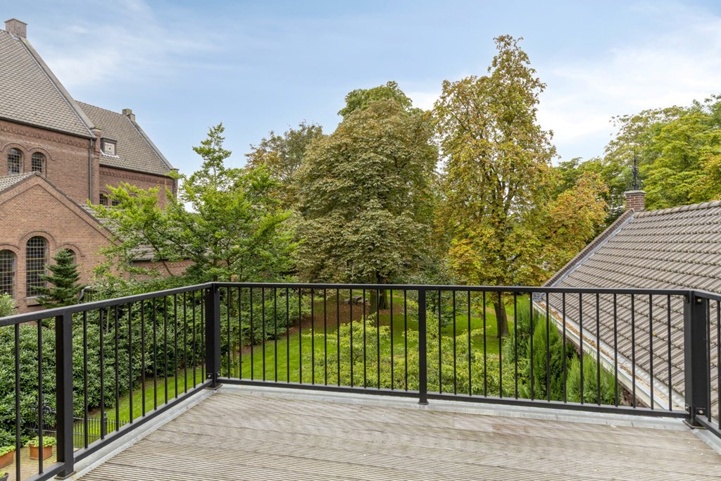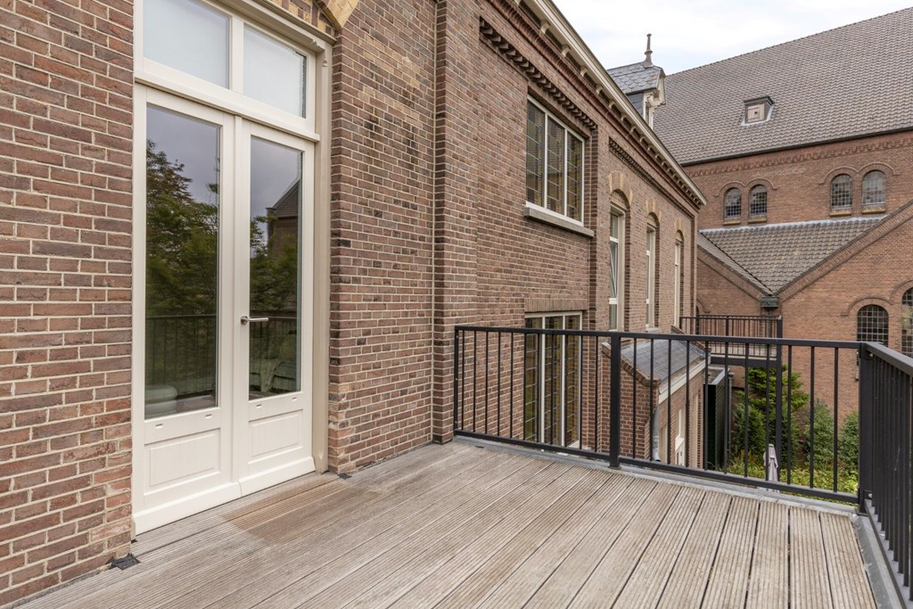De woonkamer biedt de ruimte veel het realiseren van een gezellige zithoek en eventueel nog een werkplek. Het geheel is afgewerkt met een pvc-vloer en strakke stucwerk wanden- en plafonds. Vanuit de woonkamer toegang tot het ruime balkon aan de achterzijde van het appartement met prachtig zicht op de prachtige tuin van de pastorie.