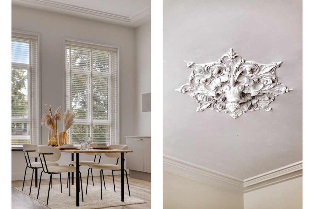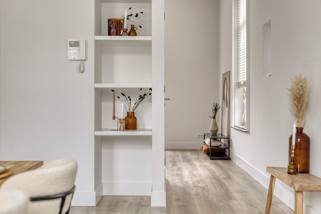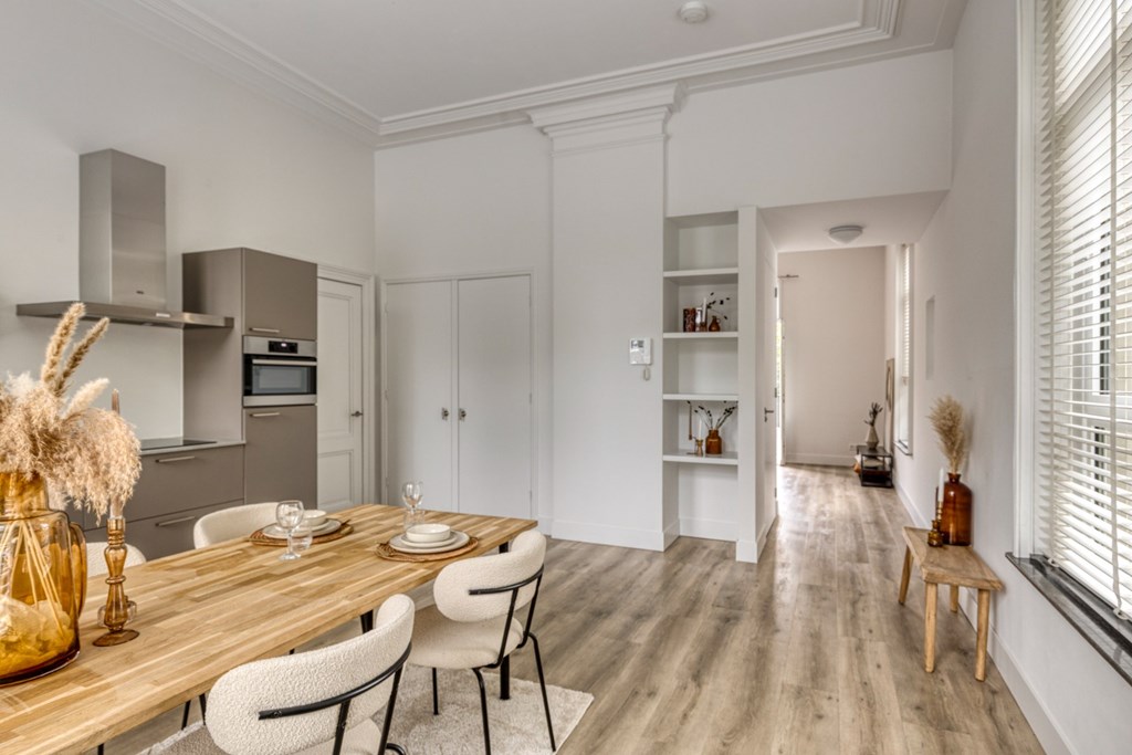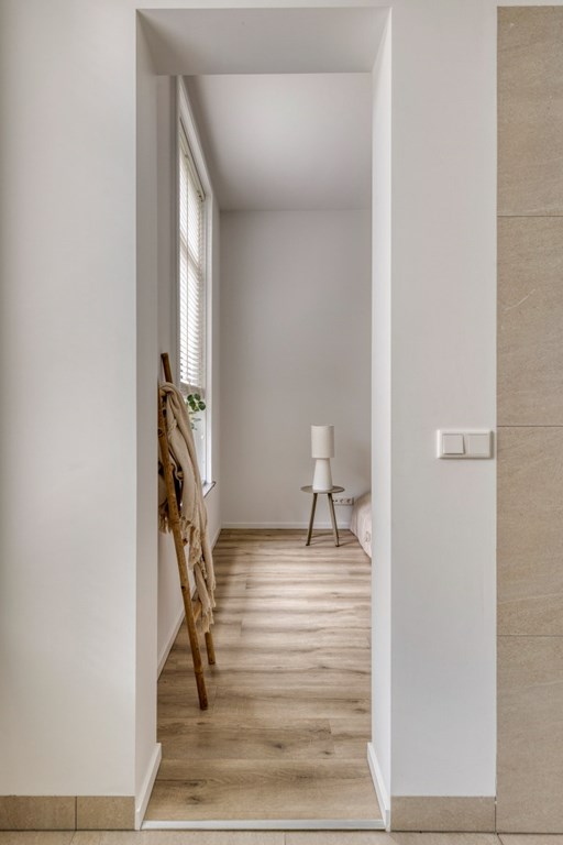 Via de overloop op de 1e verdieping toegang tot het appartement. Wat meteen opvalt is de hoogte van de plafonds. De hoge plafonds en de ramen geven het appartement extra uitstraling en een gevoel van ruimte en licht.