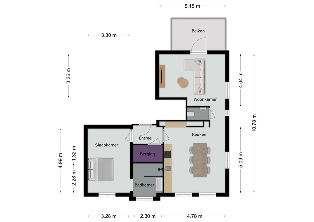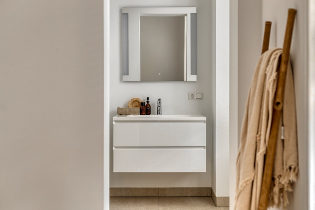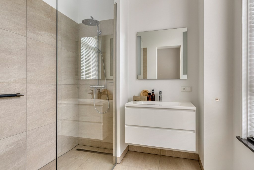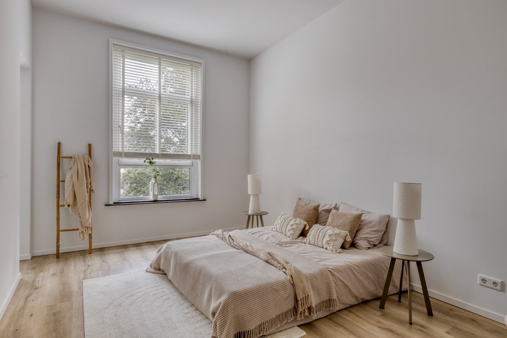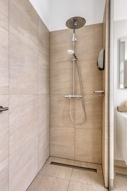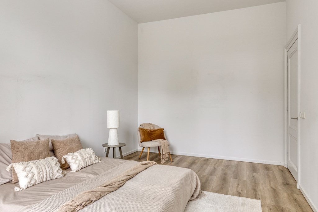 Het portaal is afgewerkt met een pvc-vloer die doorloopt door het gehele appartement. Vanuit het portaal toegang tot ouderslaapkamer, de keuken en de praktische berging met elektrische boiler, witgoedaansluitingen en de meterkast. De ouderslaapkamer (5.05m x 3.23m) biedt meer dan voldoende ruimte voor een groot 2-persoonsbed en een kledingkast. Via de ouderslaapkamer toegang tot de moderne badkamer en-suite ingericht met een inloopdouche en wandmeubel met dubbele wastafel. Het geheel heeft een keurige en moderne uitstraling.