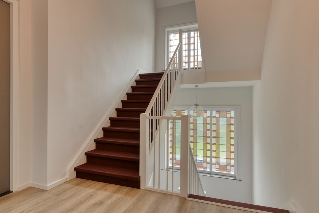De prachtige statige entree geeft toegang de lift, de kelder en tot de trapopgang naar de verdiepingen. Diverse originele kenmerken zijn tijdens de grote renovatie behoudt gebleven zoals de ornamenten tegen het plafond en het glas-in-lood bij de trapopgang.