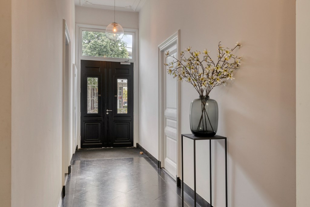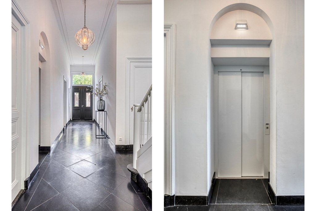 De prachtige statige entree geeft toegang de lift, de kelder en tot de trapopgang naar de verdiepingen. Diverse originele kenmerken zijn tijdens de grote renovatie behoudt gebleven zoals de ornamenten tegen het plafond en het glas-in-lood bij de trapopgang.