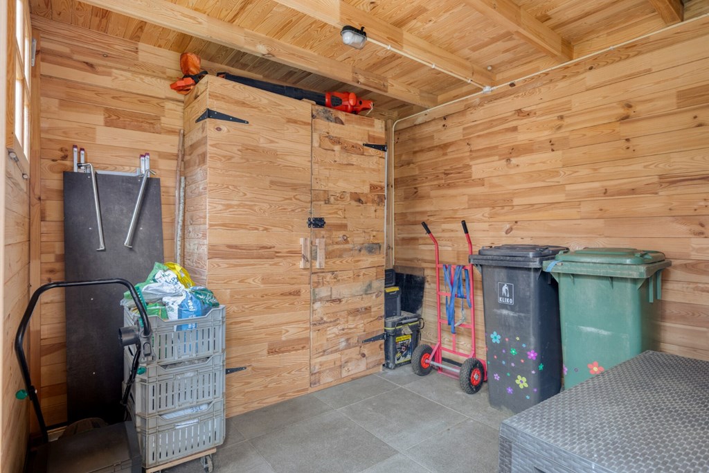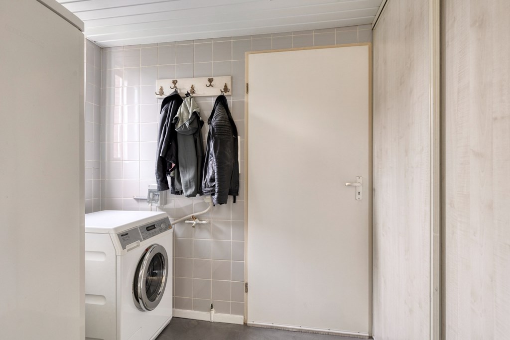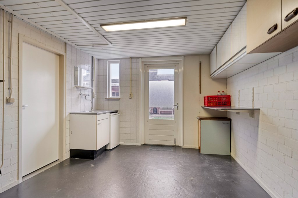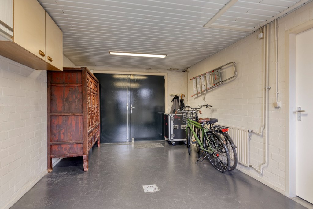 Praktische bijkeuken met witgoedaansluitingen, garderobehoek en vaste kasten wand voor opslag en voorraad. Via de bijkeuken inpandige toegang naar de garage. Deze ruimte is afgewerkt met een gietvloer en schoonmetselwerkwanden. Dubbele openslaande deuren in de voorgevel van de garage en aparte loopdeur aan de achterzijde naar de tuin. De garage is verwarmd en er is een klein keukenblokje met gootsteen aanwezig. Via de vlizotrap toegang tot de verdieping boven de garage; een verrassend ruime bergruimte.