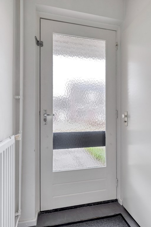 Hoofdentree aan de voorzijde van de woning, hal met meterkast en toiletruimte met hangend toilet en fonteintje (vernieuwd in 2018).