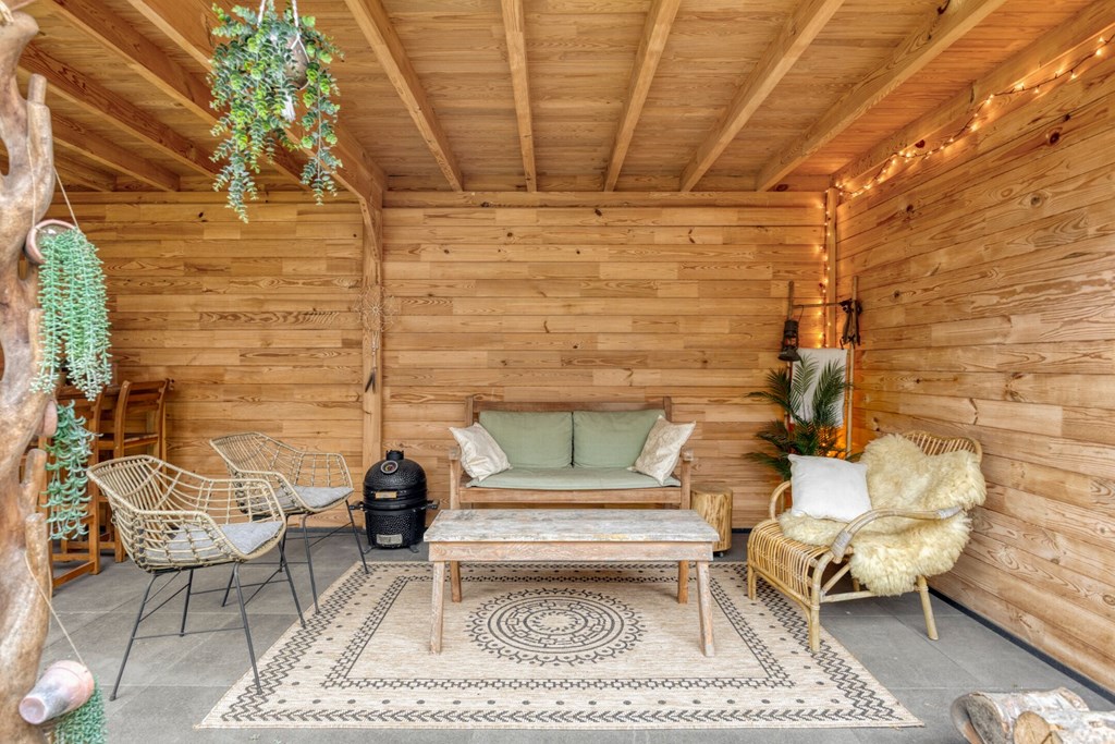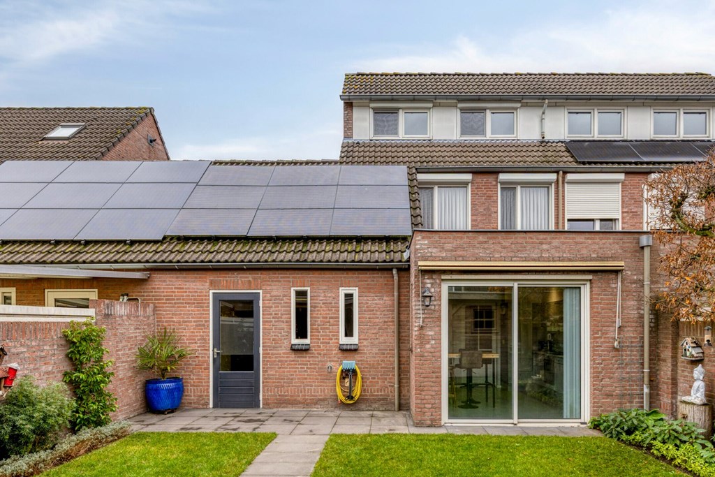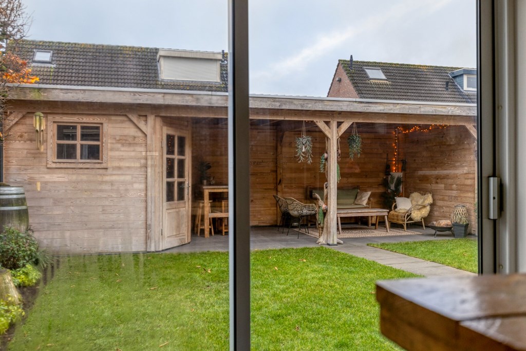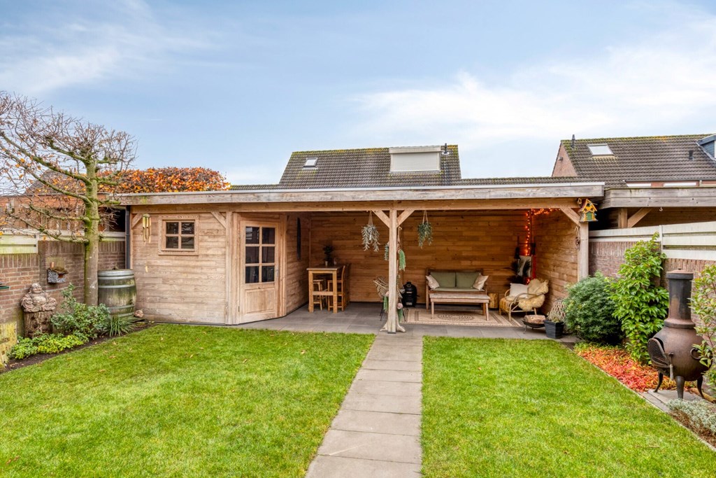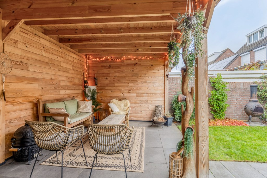 De achtertuin is ingericht met bestrating, gazon en borders met diverse beplantingen. Op de achterzijde van het perceel is een sfeervolle en grote overkapping gerealiseerd (2,86m x 7,37m) met buitenberging (ca. 2.75 x 2.85 m) Een prachtig en sfeervol zitje tijdens de mooie zomeravonden. De tuin is gelegen op het zuidwesten.