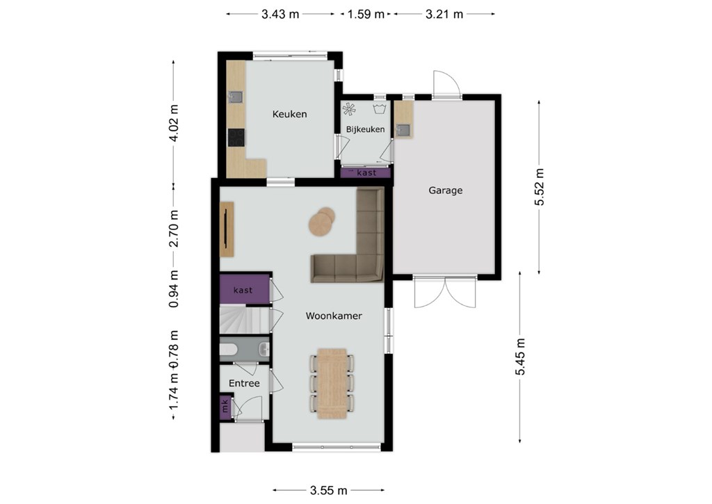 Zeer ruime woonkamer met grote raampartijen in de voor- en zijgevel en op dit moment ingericht met een eet- en zitgedeelte. De woonkamer is verder afgewerkt met een moderne gietvloer (2018), gestucte wanden en een stucwerkplafond. Vanuit de woonkamer is er een praktische trappenkast aanwezig en via een loopdeur toegang tot de trapopgang naar de 1e verdieping.