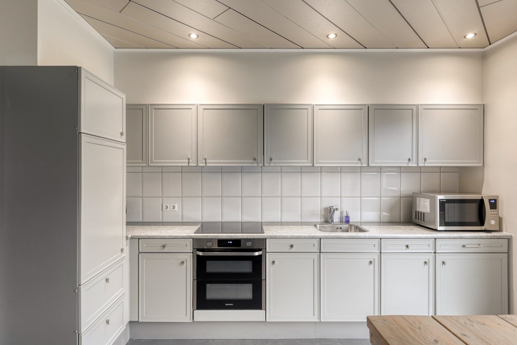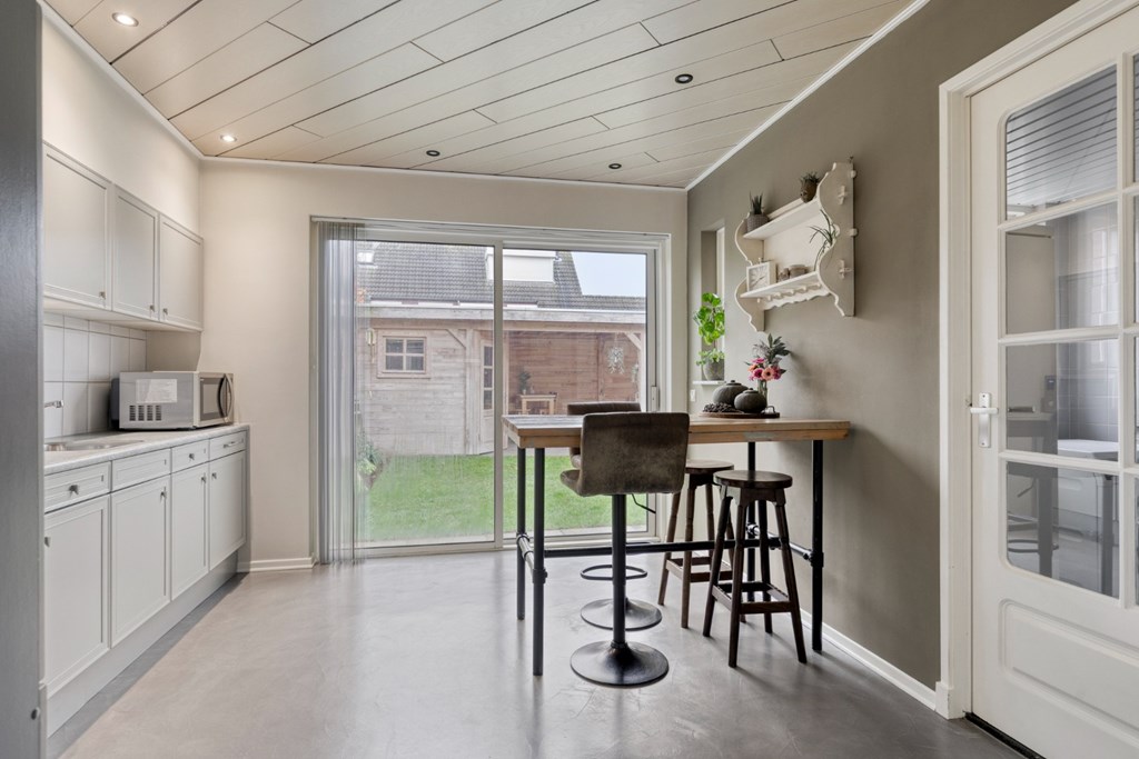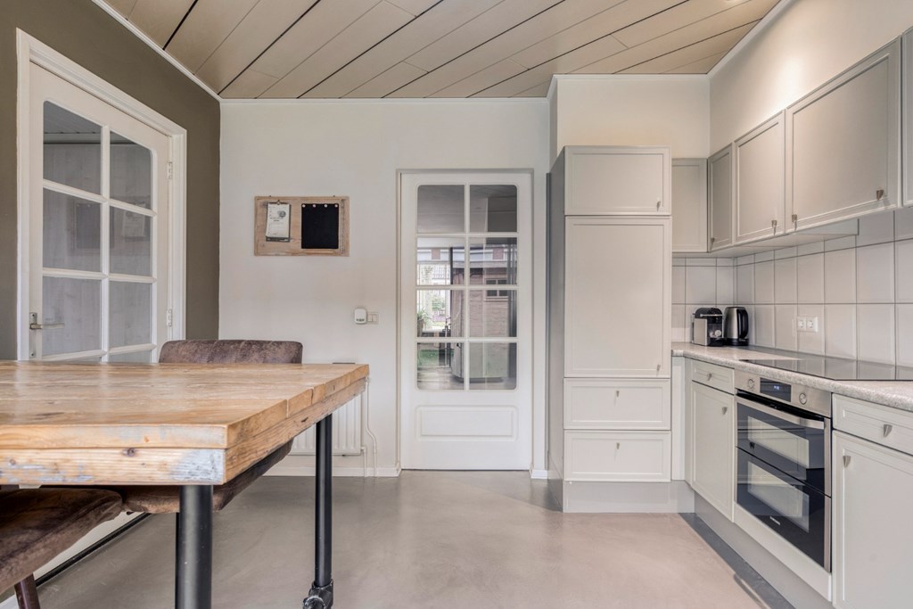 De keuken is gesitueerd in de aanbouw en is geplaatst in een L-opstelling ingericht met inductiekookplaat (2019), oven (2019), koelkast, afzuigkap en vaatwasser. Via een schuifdeur is de keuken af te sluiten van de woonkamer en er is ruimte voor een eettafel met 4 tot 6 stoelen. De aluminium schuifpui in de keuken geeft toegang tot de achtertuin.