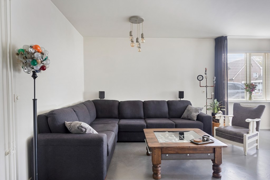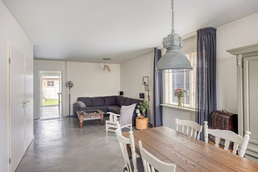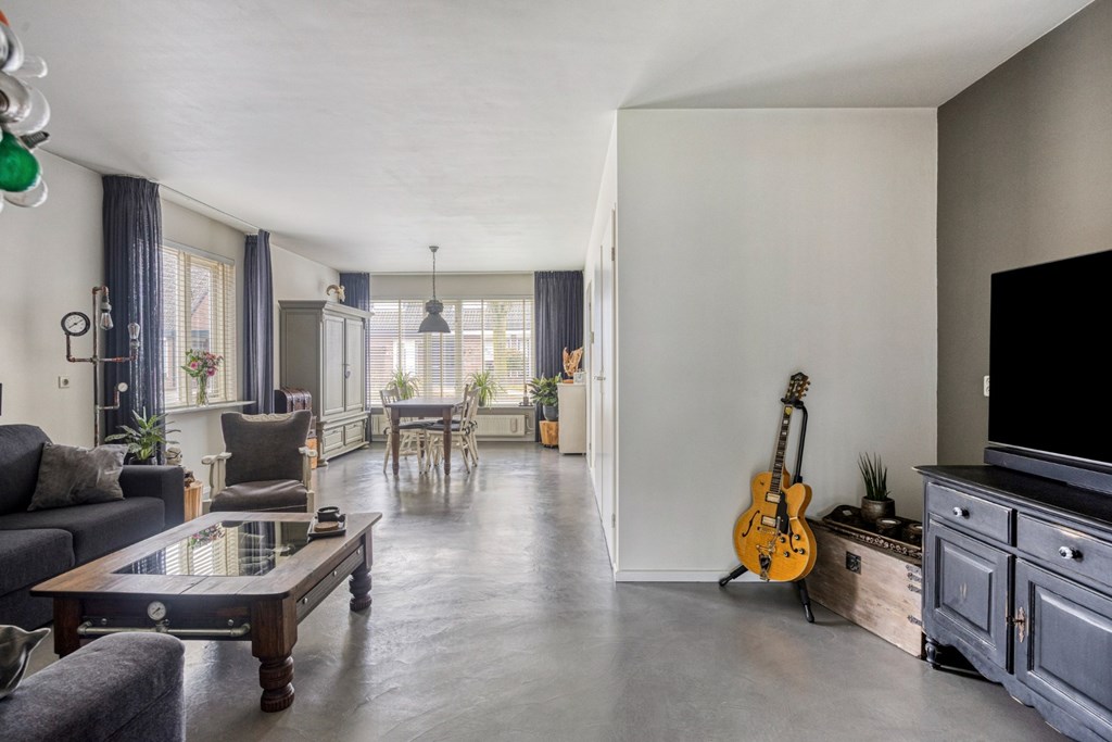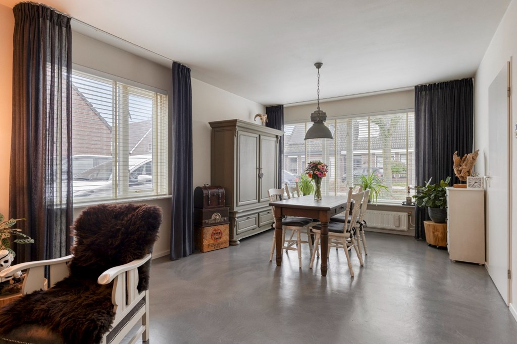 Zeer ruime woonkamer met grote raampartijen in de voor- en zijgevel en op dit moment ingericht met een eet- en zitgedeelte. De woonkamer is verder afgewerkt met een moderne gietvloer (2018), gestucte wanden en een stucwerkplafond. Vanuit de woonkamer is er een praktische trappenkast aanwezig en via een loopdeur toegang tot de trapopgang naar de 1e verdieping.