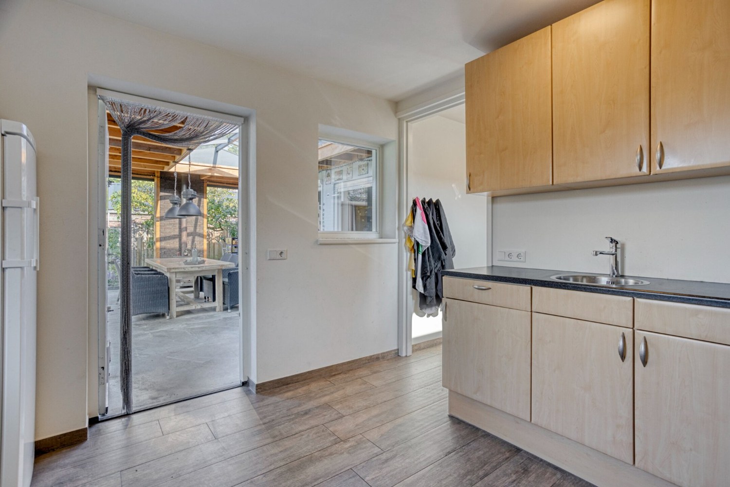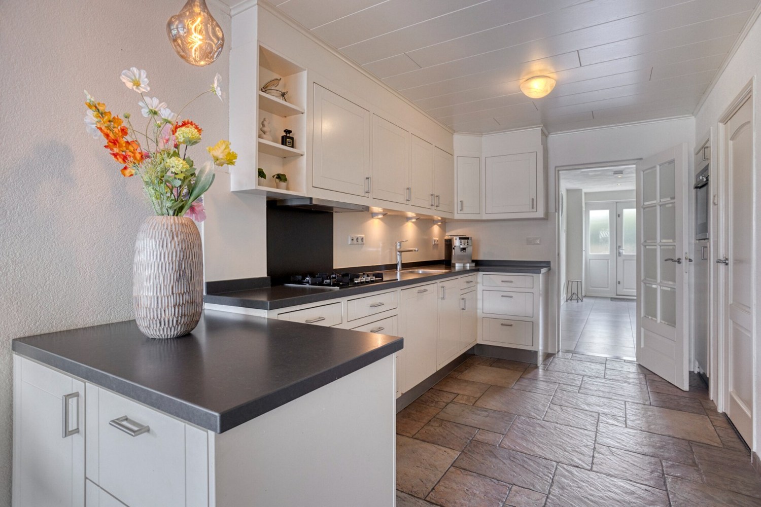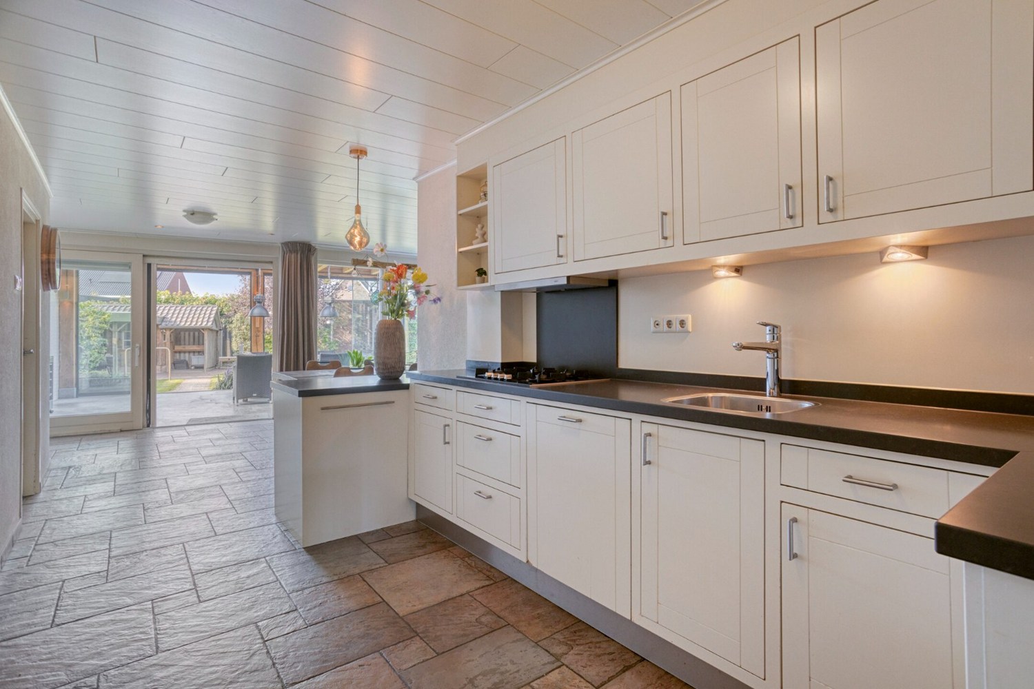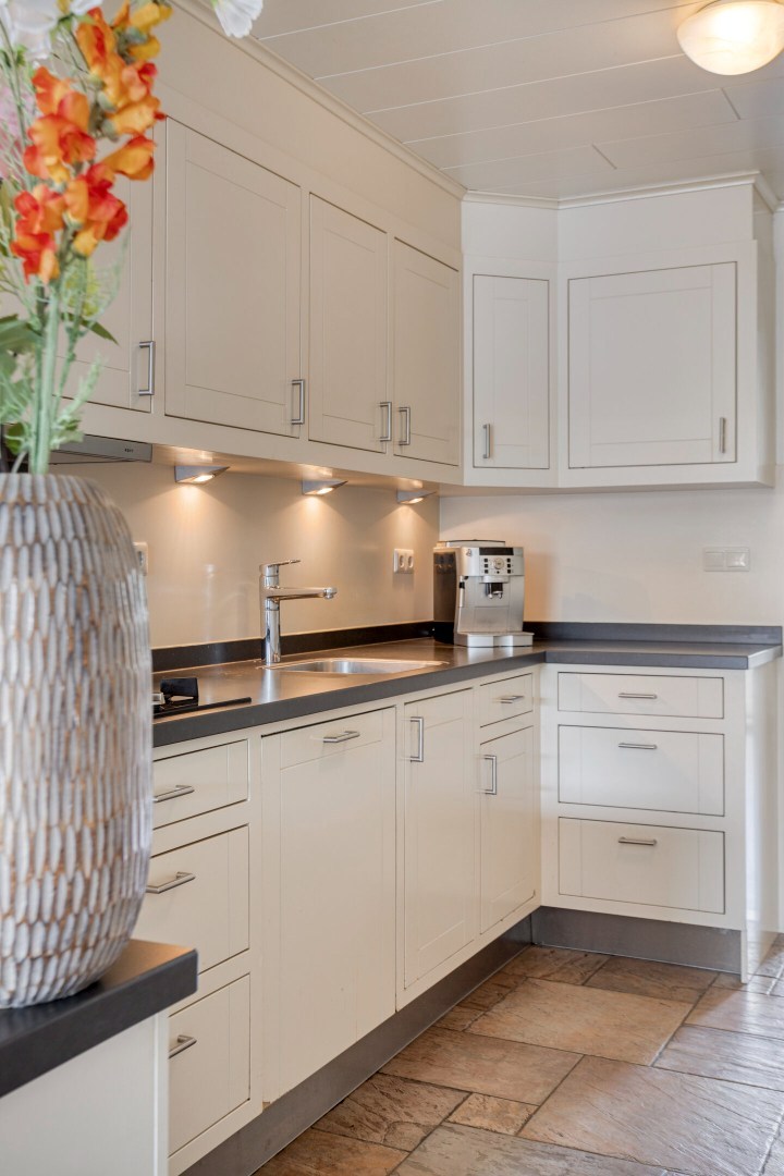 De keuken is geplaatst in een verlengde hoekopstelling en is voorzien van een granieten aanrechtblad en ingericht met vaatwasser, gaskookplaat, koelkast en diverse onder- en bovenkasten. Praktische bijkeuken met witgoedaansluitingen en voorraadruimte.