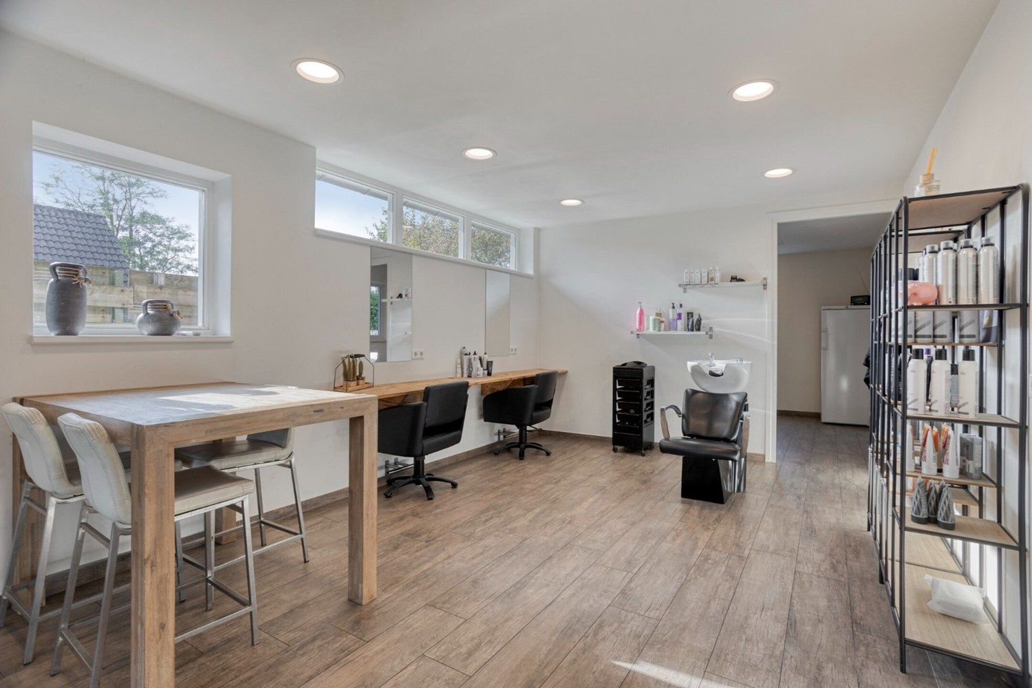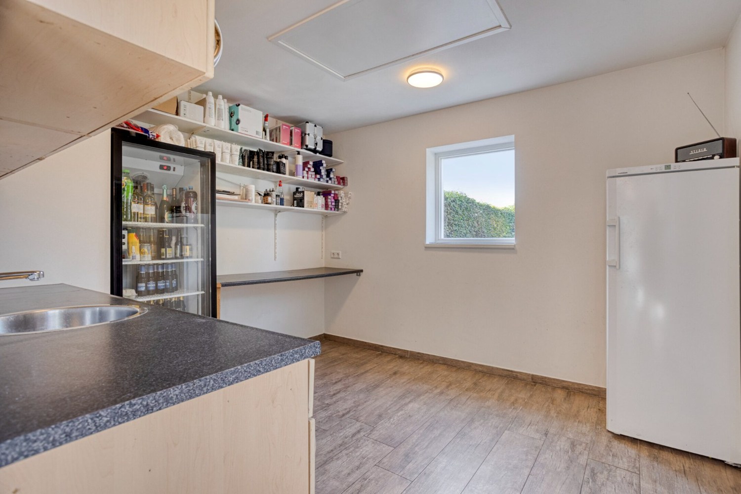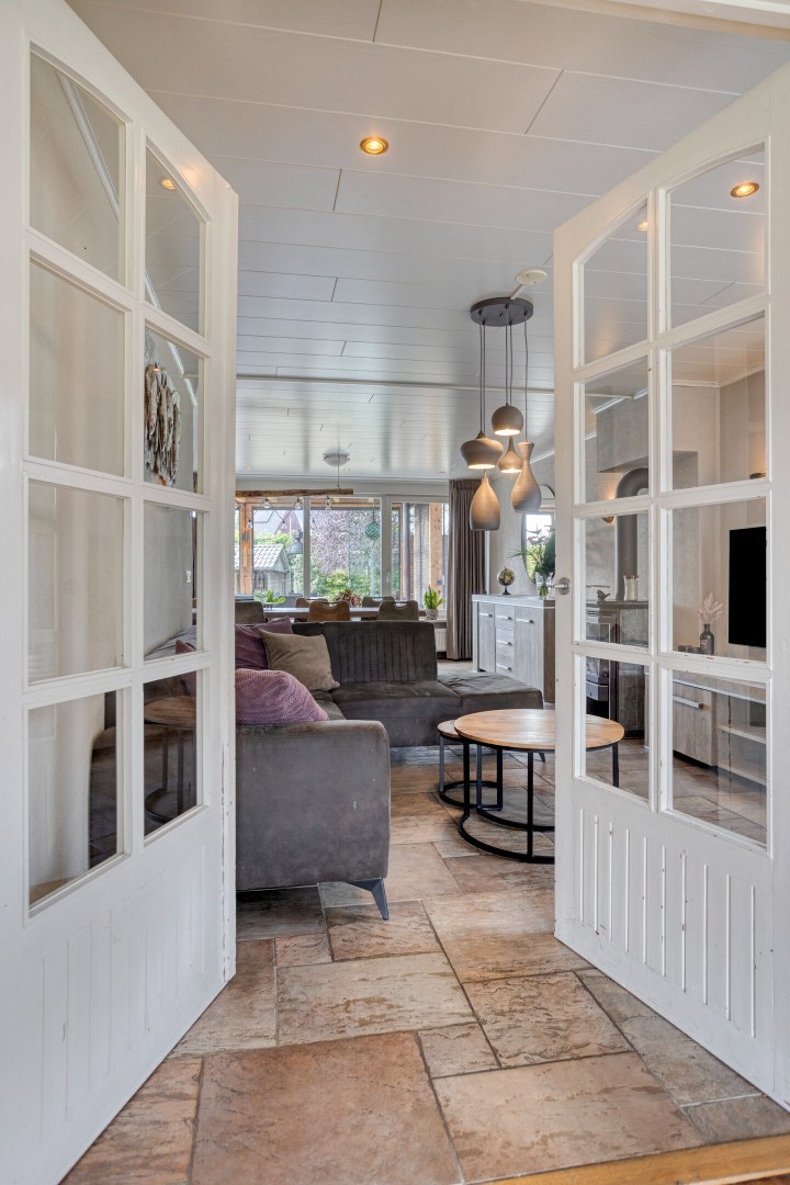 De huidige salon is een fantastische ruimte; recentelijk geheel gerenoveerd en voorzien van een tegelvloer met vloerverwarming en stucwerkwanden- en plafonds. De diverse ramen zorgen voor veel lichtinval. De salon heeft een eigen entree via de oprit. Aan de achterzijde van de salon is de berging gelegen. Een praktische bergruimte met klein keukenblok met spoelbak en via een vlizotrap toegang tot de zolderverdieping op de garage. De zolder boven de garage is geheel in gebruik als praktische bergruimte.