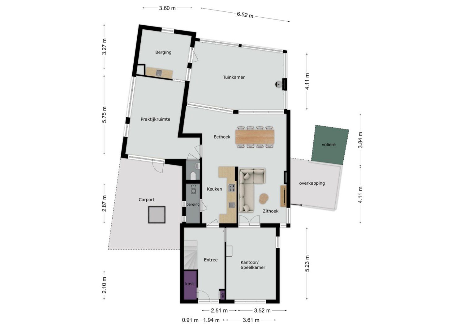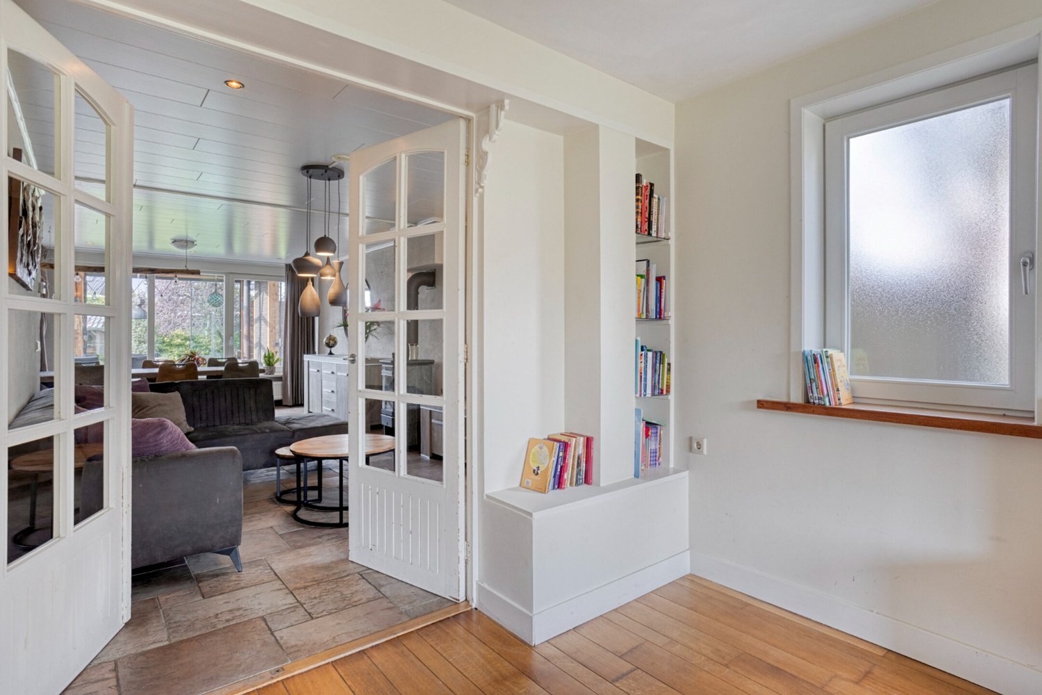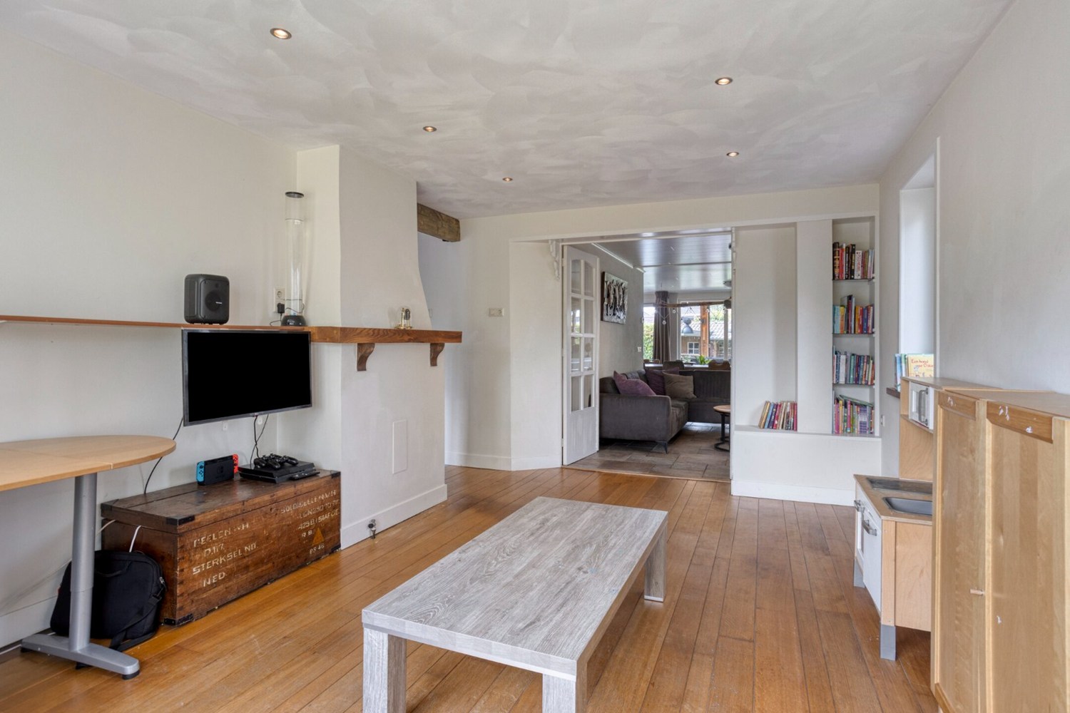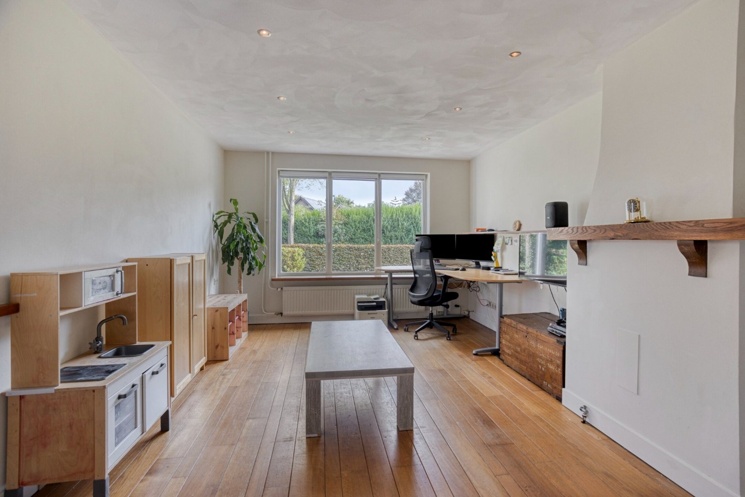 Via openslaande deuren vanuit de woonkamer toegang tot de aparte speel-/werkkamer op de begane grond. Vroeger was dit de woonkamer maar nu is het in gebruik als speelkamer voor de kinderen maar het kan ook perfect gebruikt worden als kantoorruimte. Deze ruimte is afgewerkt met een eiken houten vloer, stucwerkwanden en een stucwerkplafond met inbouwspots.