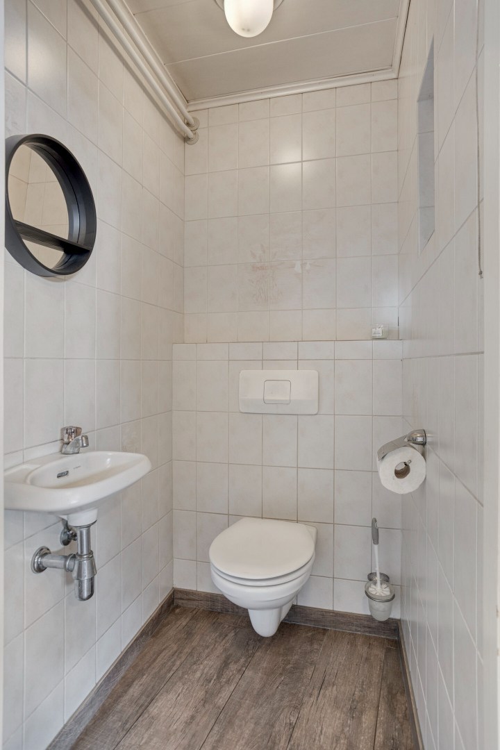 Vanuit het leefgedeelte via een deur toegang naar de voormalige garage. In deze korte gang is de toiletruimte gesitueerd. Deze is betegeld en voorzien van een hangend toilet en fonteintje.